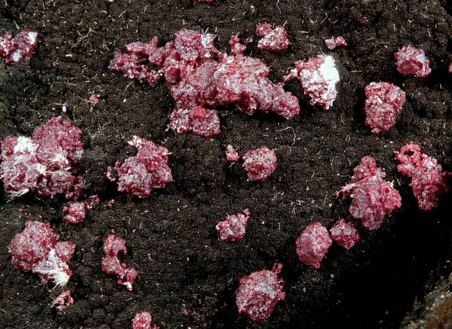 JC11901. Cobaltoan Calcite, Mashamba West , Kolwezi, Shaba, Congo (Zaire). 4 x 8 cm 123g. $45.00. Magenta crystals as seen. Contact area near the top center as can be seen. |