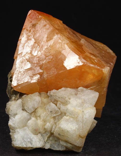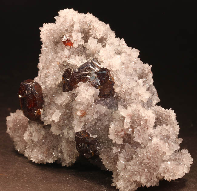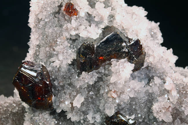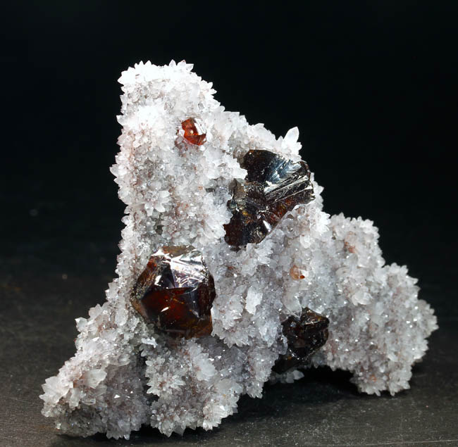 BR221. Sphalerite, quartz. Shuikoushan Mine, Shuikoushan ore field, Changning Co., Hengyang, Hunan, China. 7 x 6 x 2 cm 109g $375.00 Three crystals, largest 2 cm on drusy quartz. Fairly gemmy, and quite translucent. The sphalerites are a bit lighter in color. Reddish orange gemmy Sphalerite crystals with typical complex twinning are well exposed on contrasting matrix. Excellent luster, the Sphalerites with backlighting glow a bright reddish orange/amber, they can seem very dark without it. From the vintage finds at Shuikoushan; in excellent condition with no visible damage. The matrix is druzy quartz. Very esthetic, these were once found in large quantities but few were this choice, they are no longer coming out from this locality. When I tried to lighten up the photos to show the true color on the sphalerites, the quartz got so white that it lost crystal definition on the photos. Ex: Roberts Minerals Purchased: 4-1999 |