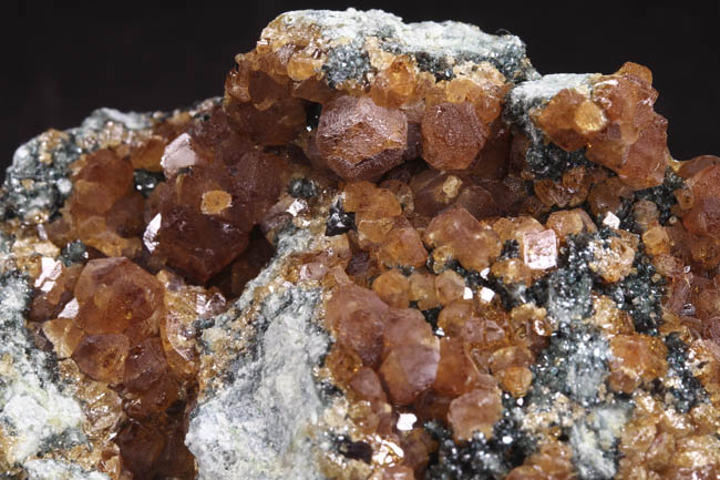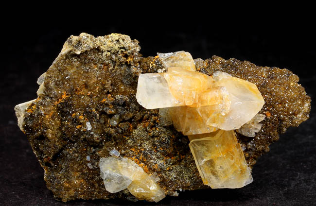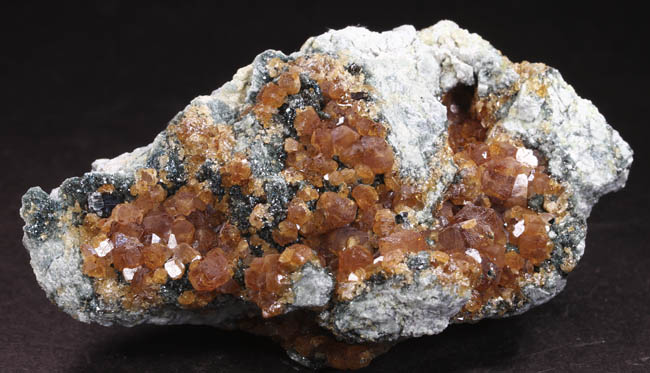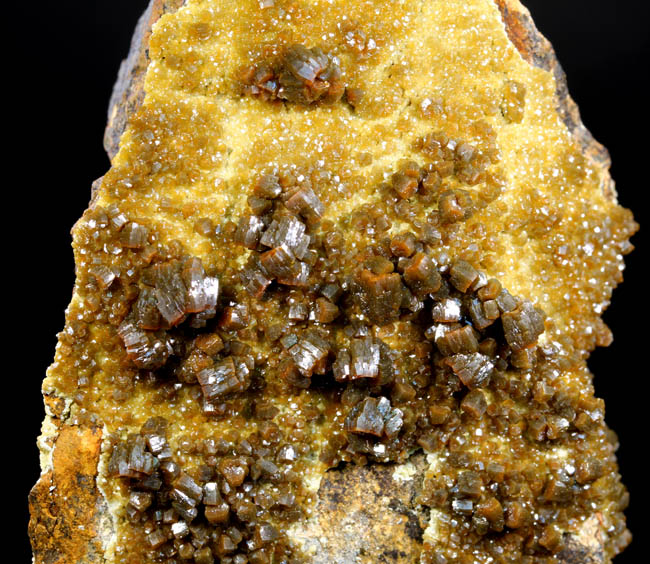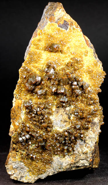 BR264. Topazolite var. andradite, clinachlore. Yellow Cat mine, Serpentine dome, New Idria district, San Benito county, California. 8 x 4 x 2 cm 95g $400.00 Golden crystals to about 6mm across, with nice bright luster. Ex: Steve Perry Minerals Purchased: 8-2007. Much better than most from here. Specimens of this quality have not come out from here in several years. RESERVED |