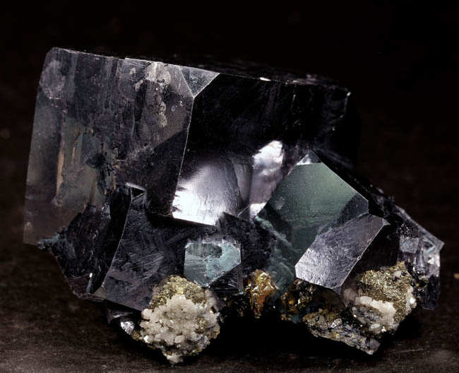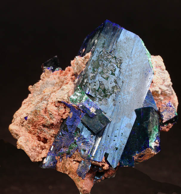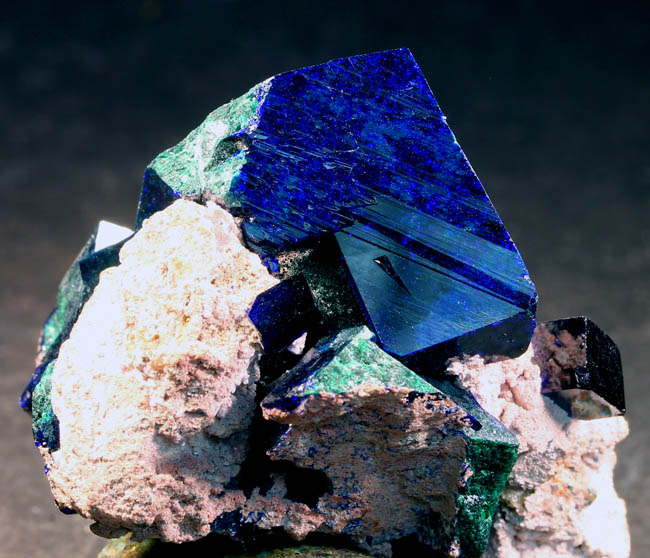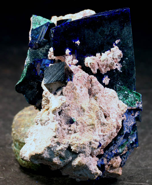 BR619. Azurite, duftite, quartz. Tsumeb mine, Tsumeb, Namibia. 3 x 4 cm 21g $325.00 Two azurite crystals, blocky, 1.5 cm and 2 cm on quartz, with duftite on matrix. Ex: Claude H. Yoder coll.#1837 Purchased: 4-2006 Ex: Mineralogical Research. |
