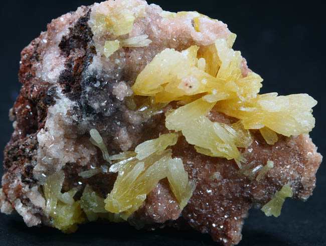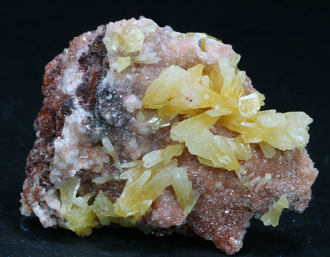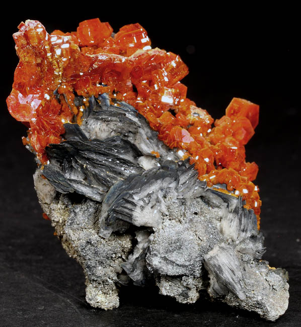 JC9864. Vanadinite, barite. ACF mine area, Mibladen mining district, Midelt, Khenifra province, Meknes-Tafilalet region, Morocco. 7.5 x 7.5 cm 290g. $135.00. Dark red crystals on black coated barite blades. One vanadinite on the upper left edge has two small dings on it...visible in the photo as two white spots on the crystal. There are two barite blades with rub marks on them, and one broken small barite blade...they show up as white spots on the black matrix. |