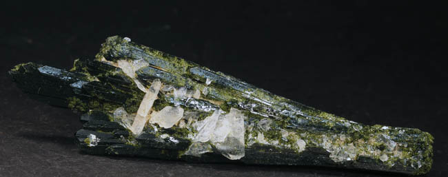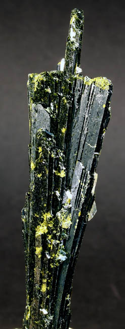 BR466. Epidote, quartz. Capelinha, Jequitinhunha valley, Minas Gerais, Brazil. 9.5 cm long x 2.8 cm wide. 37g. $90.00 Ex: Crystal Mine JC6041 . Ex: Jim McEwen coll.#2403 Purchased: 6-2011. The lighter green with a yellowish tint that is spotted around on the crystal is much more subdued in reality. Dark green lustrous crystal group. |
