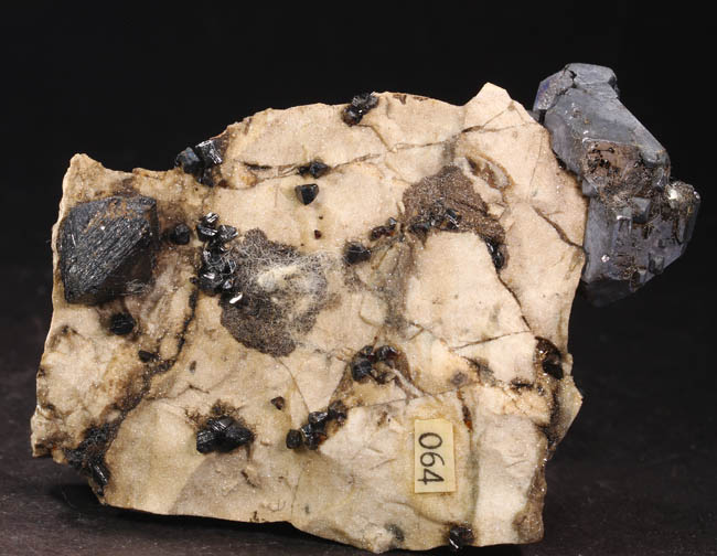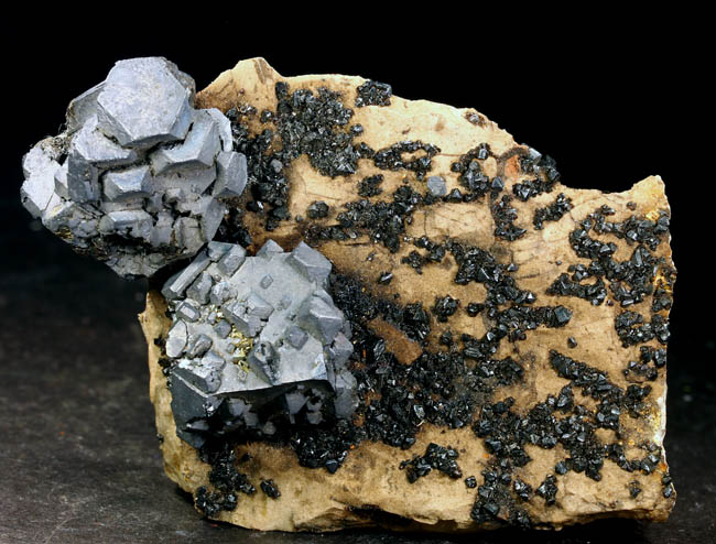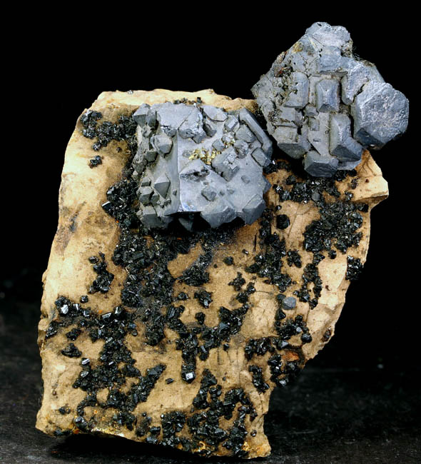 BR621. Galena, sphalerite. Mid Continent mine, Treece, Cherokee County, Kansas. 6.5 x 5 x 1.5 cm 117g $150.00 Two 2 cm cubes of dull luster galena, on chert with mm size rather dull sphalerites. Ex: Uncarved Block Minerals. |