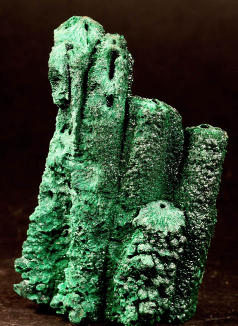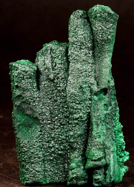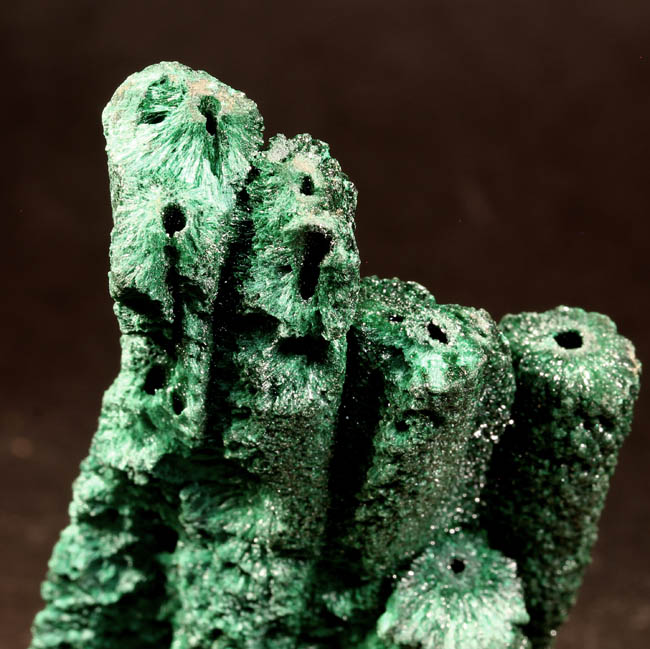 BR624. Malachite. Democratic Republic of Congo (formally Zaire). 4 x 7 cm tall. 87g $98.00 Four parallel stalagmites, not terminated. Sparkly. Ex: Geotrope Minerals On at least one of these the hole goes from top to bottom and you can blow air through it. RESERVED |