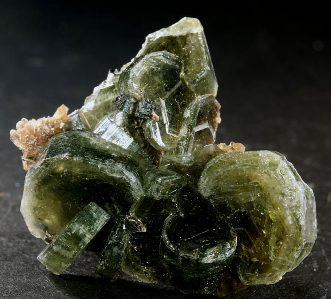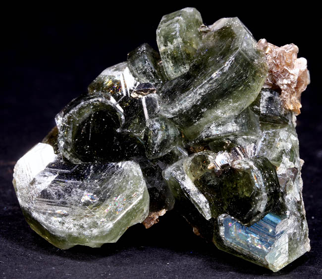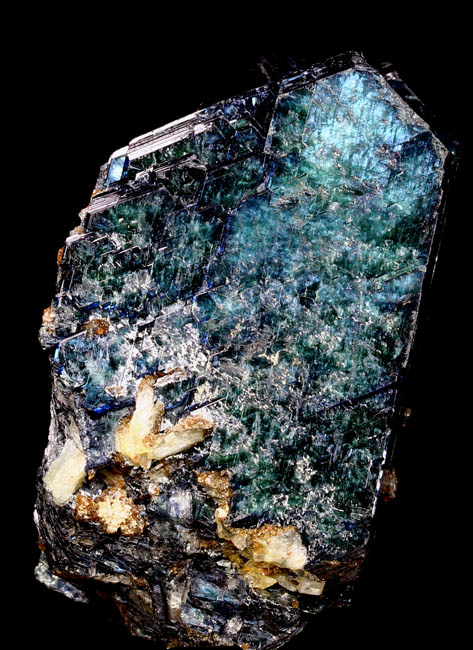 JC11789. Vivianite. Machacamarca district, Cornelio Saavedra Province, Potosí, Bolivia. 3 x 5.8 cm 73g $45.00. stout green crystal with apparent twinning. A bit of brown childrenite and some light green paravauxite. Ex. Alfredo Petrov coll. Back side has an almost iridescent green color to it, visible in the photo below. |