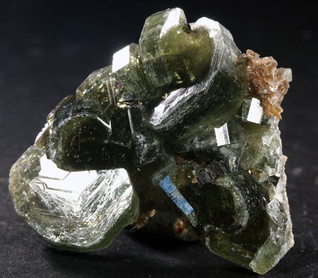 BR74. Apatite, arsenopyrite, mica. Boca Grande mine, Covilhă, Castelo Branco, Portugal. 4.5 x 4 x 1.5 cm 24g $275.00 Group of flat, green crystals to 2cm in size. Tiny, brilliant silver micro crystals of arsenopyrite here and there. |