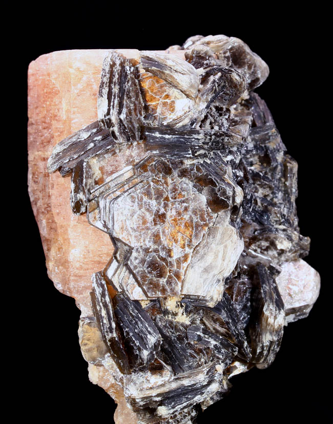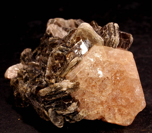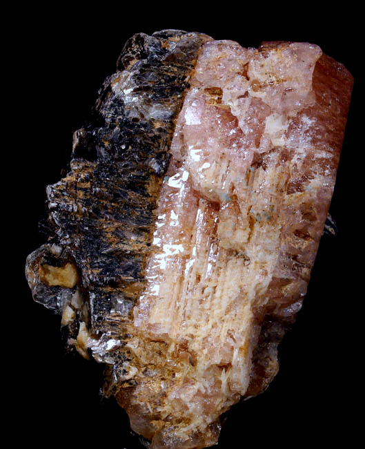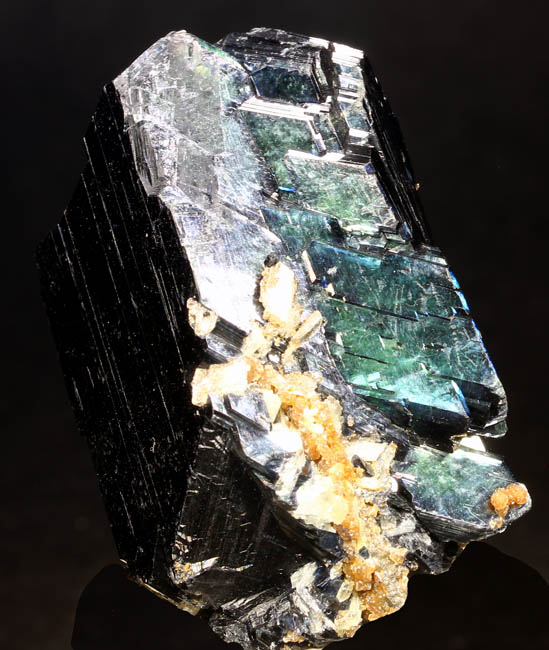JC11883. Back side, I tilted it a bit to show the crystal faces down the back side, where it probably grew against a pocket wall or something that interfered with proper growth resulting in a series of offset crystal faces, some seen reflecting the light here. |