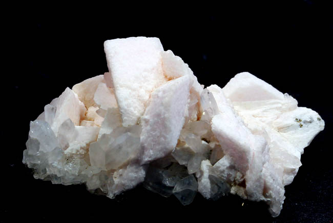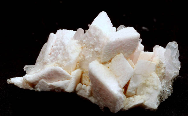 JC11831. Manganocalcite, quartz. Pachapaqui mining district, Bolognesi Province, Áncash, Peru. 2 x 3 cm 8g $8.00. Bladed crystals, not lustrous. Fluorescent sort of reddish pink. |