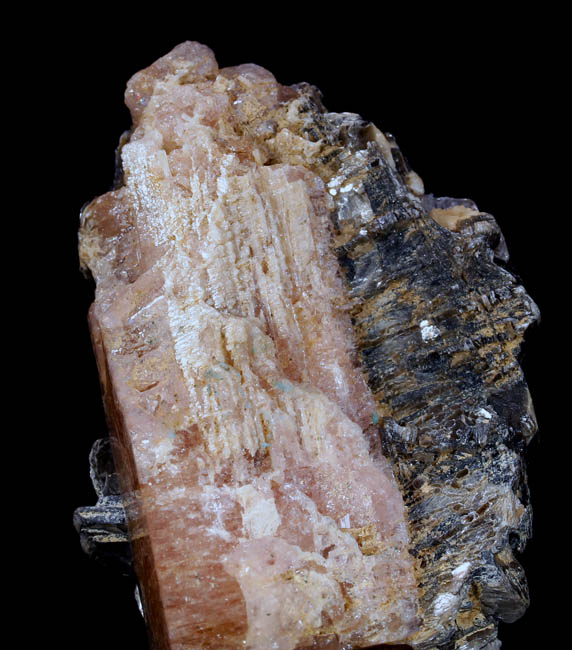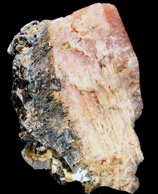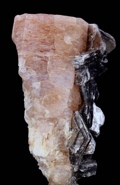 JC11883. Apatite (pink), muscovite. Gilgit District, Northern Areas, Pakistan. 4 x 5.5 cm 64g. $50.00. A light pink apatite crystal, complete on one end and tapering down at the other. The backside is incomplete, and is composed of numerous small faces where the growth was interfered with, not broken. This is a view of the termination. RESERVED |