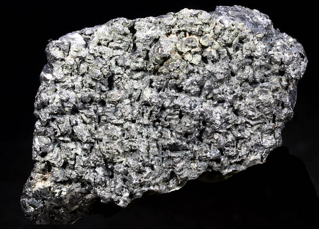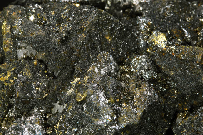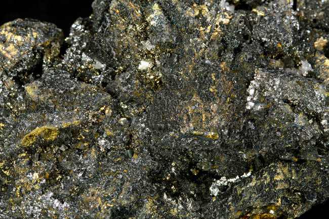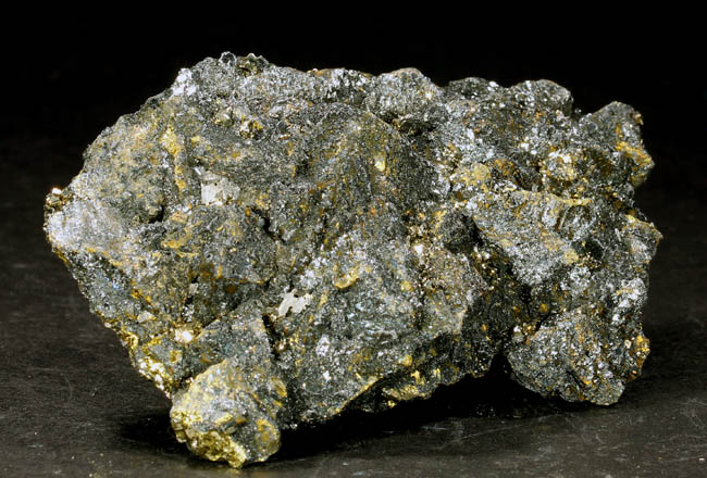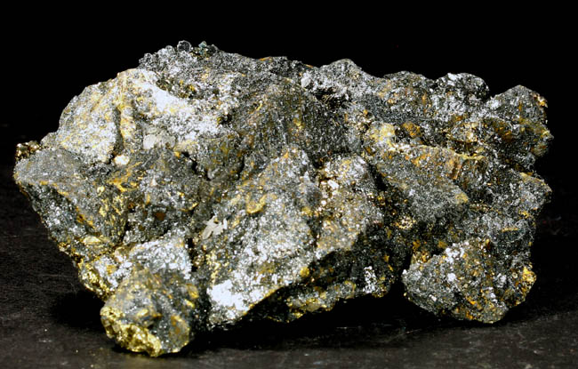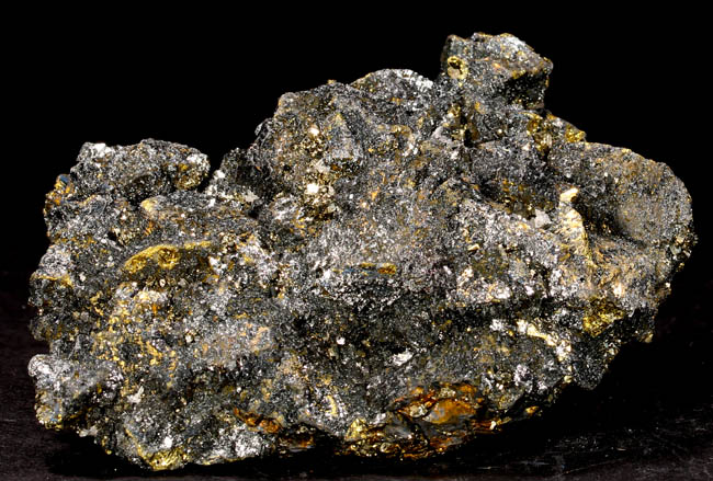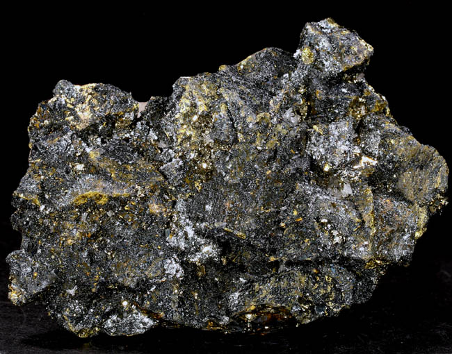 JC13381. Chalcopyrite, "freibergite", minor pyrite. Eagle mine, Gilman, Eagle county, Colorado. 7 x 4.5 cm 80g $40.00. Ex Crowley Collection #451. Acquired September 1979 from Mathiason Minerals, Fremont, California. A flat plate of good sized chalcopyrite crystals mostly coated by micro crystals of "freibergite" which is actually microscopic tetrahedrite. Lots of sparkle to the tetrahedrite. Nice golden color to the chalcopyrite. |