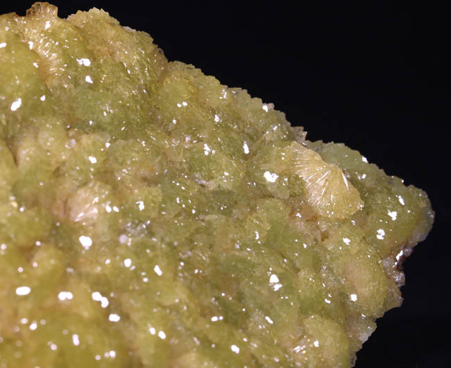 JC9516. Adamite. Ojuela mine, Mapimi, Durango, Mexico. 7.5 x 11.5 cm 180g. $245.00 A classic flat plate of yellow green adamite. The individual groups are somewhat flattened cogwheels as seen a little better in the close up below. Not fluorescent. Bright luster, pretty piece. RESERVED |