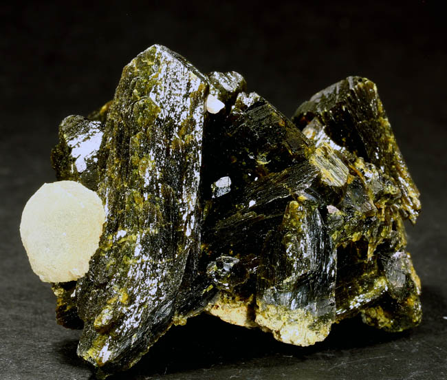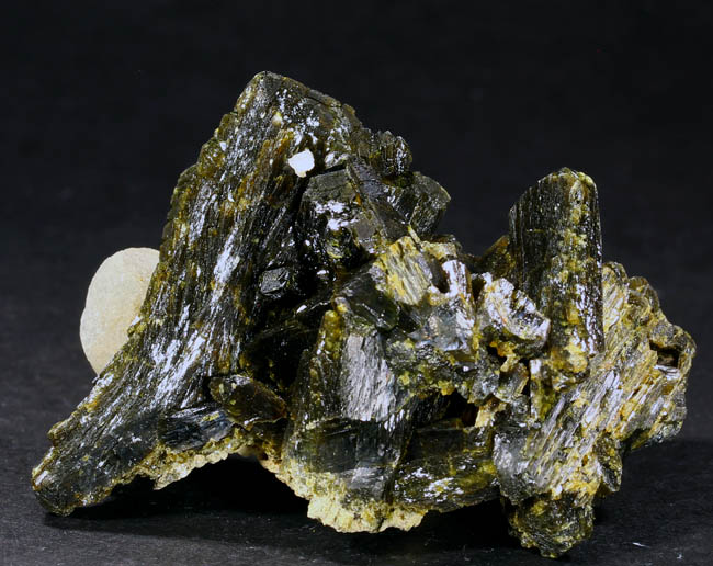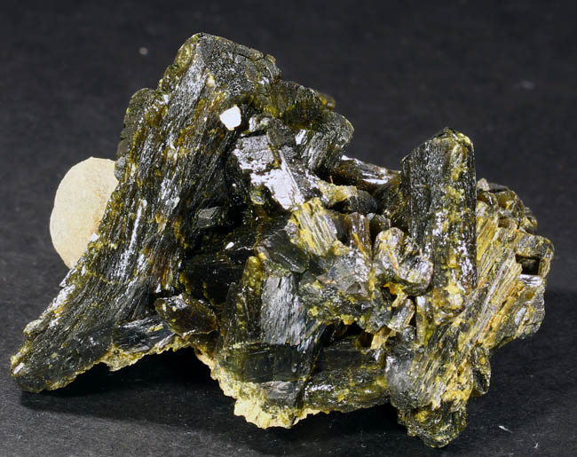 JC9901. Epidote, quartz. Rosario Mabel claim (Flor de Peru II claim), Pampa Blanca, Castrovirreyna district, Castrovirreyna province, Huancavelica department, Peru. 5 x 9 cm 138g. $30.00. A couple of sprays on quartz. From the finds of several years ago. Some of the terminations on the epidote are gone...typical of so many of these. Has nice luster. Looks better in person. |
