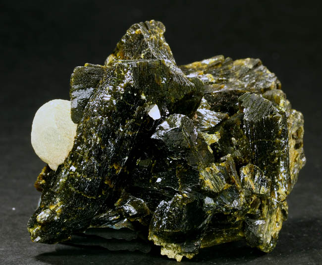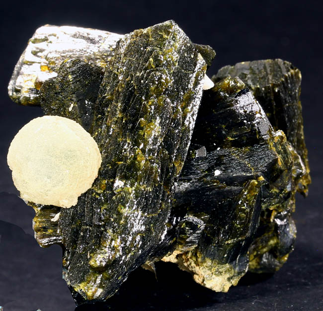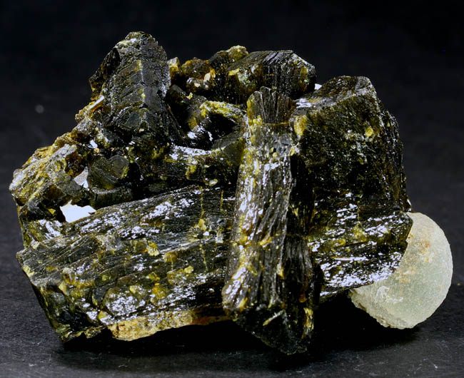 JC9834. Epidote, prehnite. Bendougou village, Arrondissement Diakon, Commune Diakon, Cercle de Bafoulabe, Kayes region, Mali. 4 x 5.5 cm 106g. $20.00. Although a bit hard to tell from the photos, this is a nice miniature of nice lustrous epidote crystals, brighter than most from here, with a ball of prehnite on the back side. There are no damaged or broken crystals on this one. The dealer brought these over from Mali in barrels with no padding, and the specimens were still covered with their original dirt. There are minor dings here and there because of the way they were shipped over to the U.S |