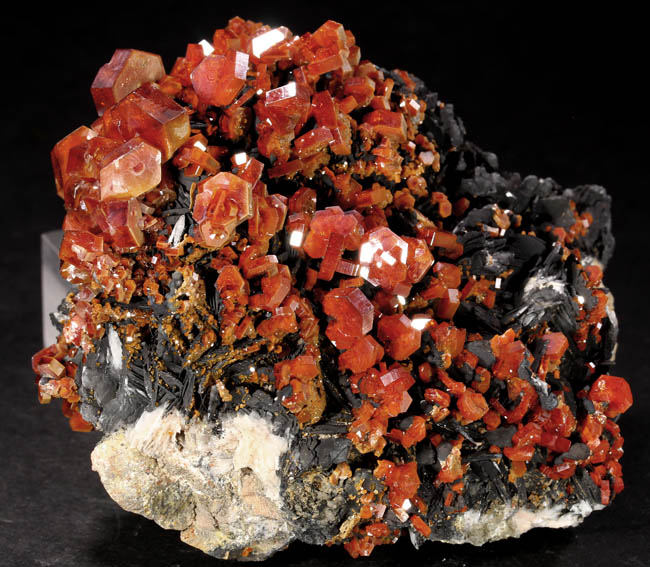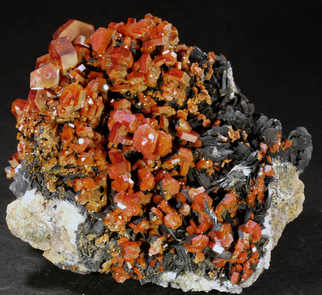 JC9859. Vanadinite, barite. ACF mine area, Mibladen mining district, Midelt, Khenifra province, Meknes-Tafilalet region, Morocco. 4.5 x 7 cm 91g. $25.00. Dark red crystals on black coated barite. There is one broken crystal, about dead center near the top, visible in the photo...it has a small black dot in the center of the broken area. RESERVED |