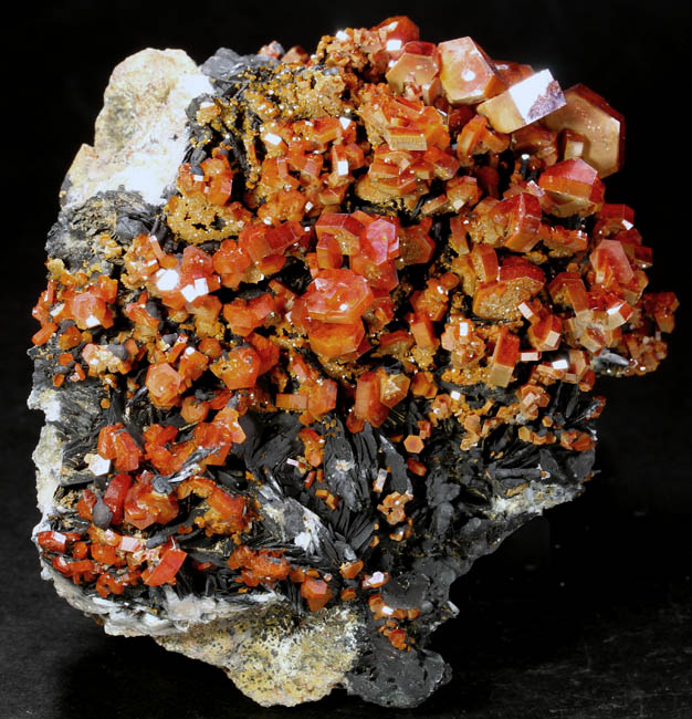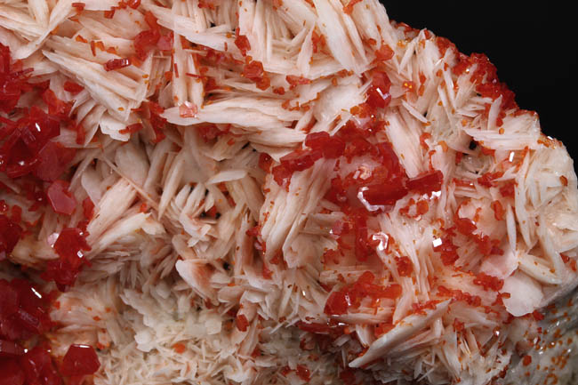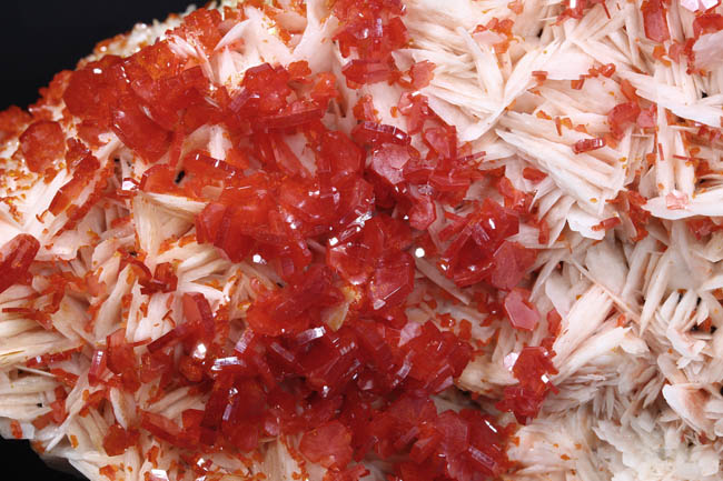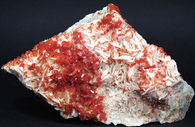 JC9904. Vanadinite on barite. ACF mine area, Mibladen mining district, Midelt, Khenifra province, Meknes-Tafilalet region, Morocco. 10 x 14 cm >1000g. $185.00. A CABINET specimen with white blades of barite partially coated with bright red, highly lustrous and gemmy, vanadinite crystals. This one had a large chunk of matrix on the back which I sawed off to lighten the weight. Pretty. |