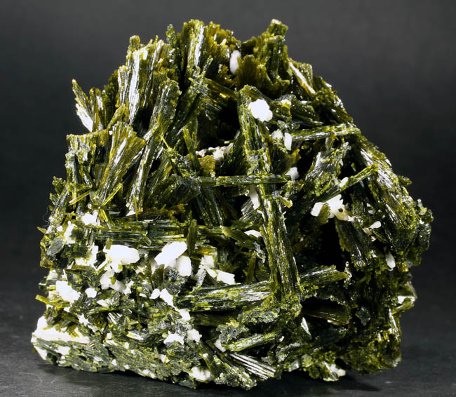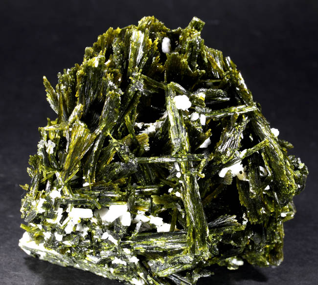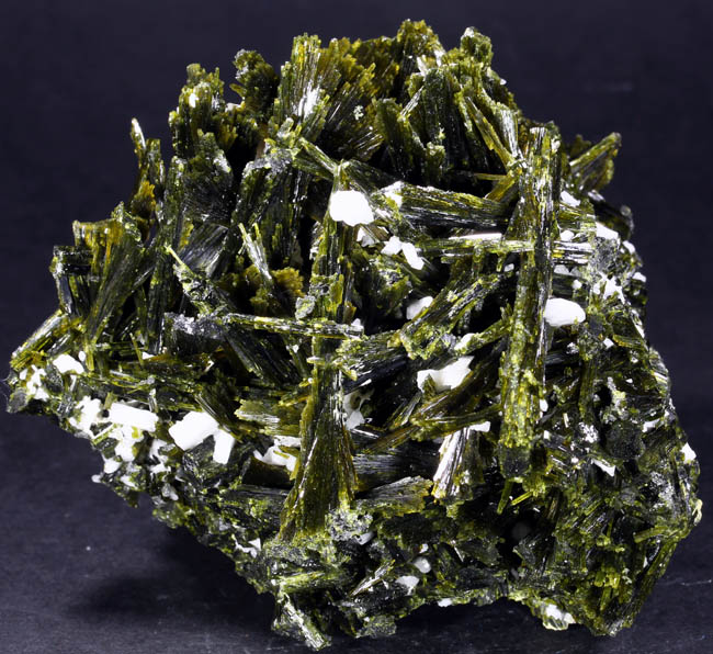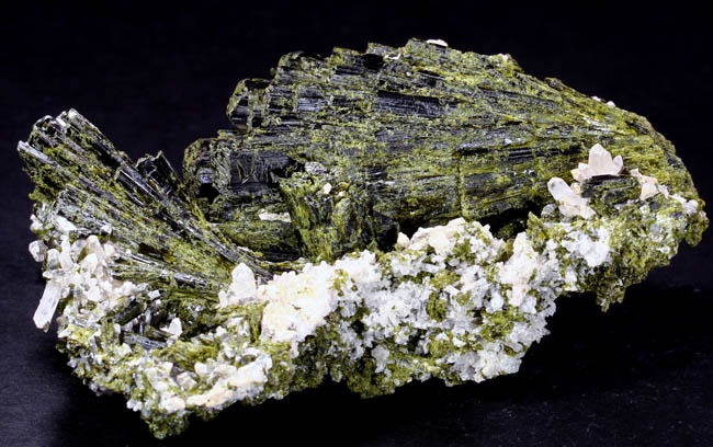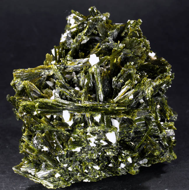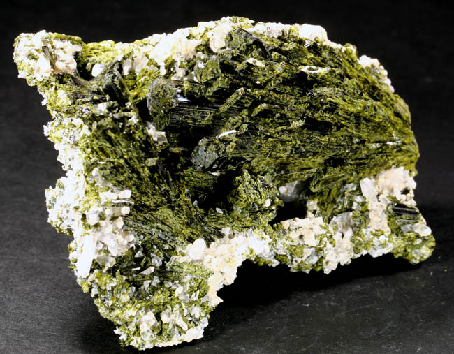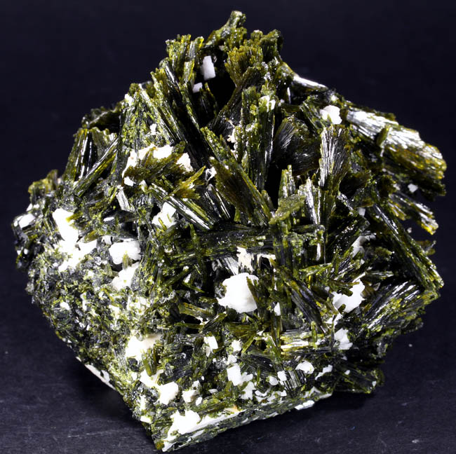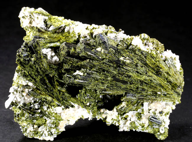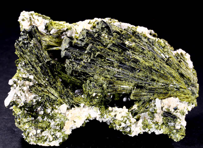 JC9943. Epidote, albite. Tormiq valley, Haramosh mountains, Skardu district, Gilgit-Baltistan, Pakistan. 8 x 8 x 8.5 cm 464g. $250.00 From a limited find at Tormiq. Talking to the dealer that had these, they apparently came from a single pocket collected in late 2017. The matrix is orthoclase (or microcline?). Suspended in the epidotes are scattered white crystals of albite for nice contrast. The specimens consist of a dense mass of green epidote sprays in an almost jackstraw like habit. Luster is quite bright, and damage is very minimal. The specimen is a mound of crystals, with crystals on all sides of the piece. Much better in person, these are classic, superior specimens from a one time find of limited extent. Searching the internet, I have found a few of these in miniature to small cabinet sizes for over $1,000. This one had some excess matrix which had to be trimmed off with a trim saw, so there is a small 2 cm or so saw mark on one edge of the base, visible in this photo on the base of the specimen. A very nice specimen. I photographed it from all sides. Really stands out in the cabinet. Crowley collection #JAC9914. RESERVED |