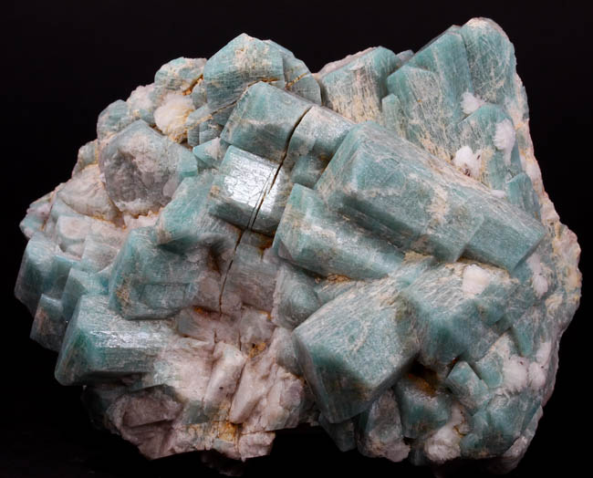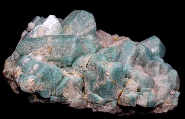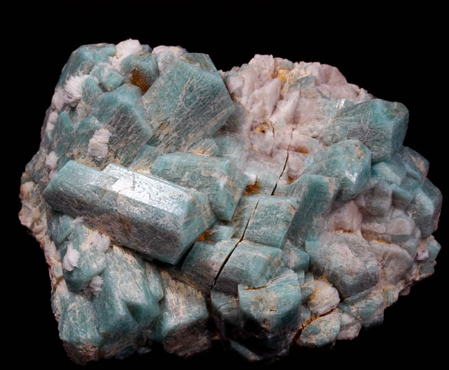 JC9957. Amazonite. Crystal creek, Teller county, Colorado. 7 x 10 cm 360 g. $50.00. Light blue crystals. The crack is a shrinkage crack, the specimen is quite sturdy. Collected in 2002. |