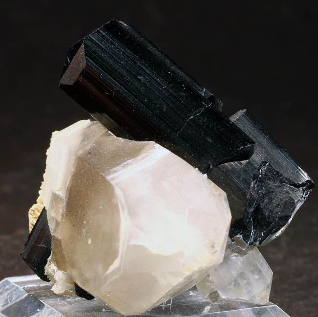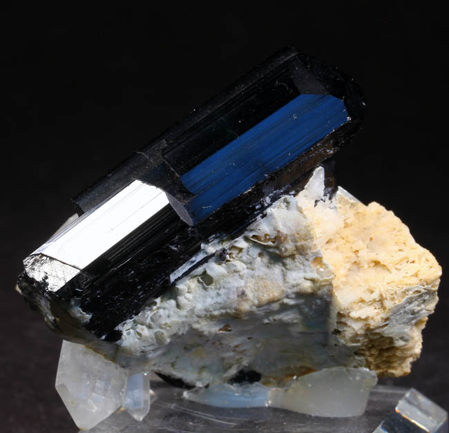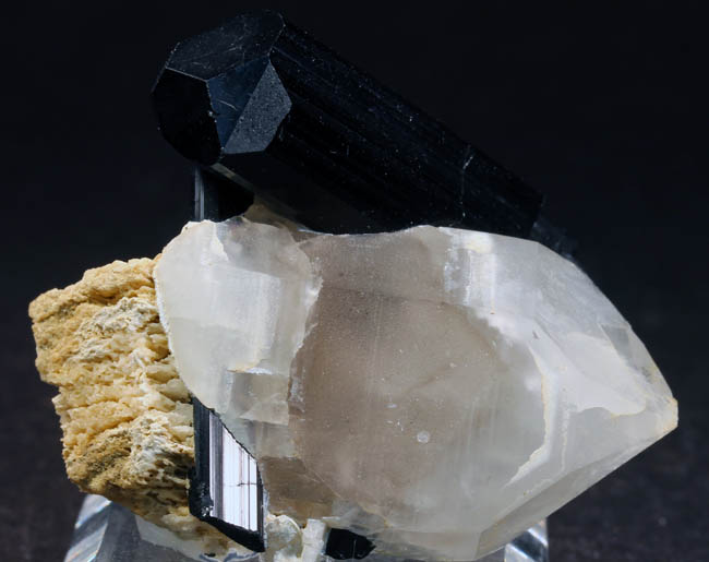 JC12043. Schorl, quartz. Shigar Valley, Skardu District, Baltistan, Northern Areas, Pakistan . 5 x 5 cm 68g $35.00 A sharp, lustrous schorl crystal on quartz crystal. Mounted on a stand. Displays nicely. |