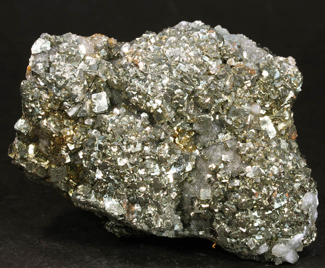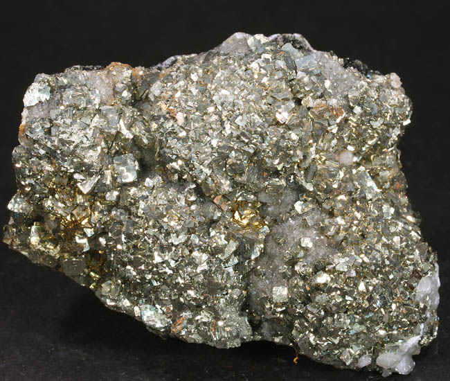 JC13904. Pyrite. Borieva Mine, Madan Municipality, Smolyan Province, Bulgaria. 7.5 x 5 x 2.5 cm 246g $25.00. Specimen completely covered with bright cubic pyrite. Lots of sparkle and pretty. Pyrite is in mound like appearance, on a quartz matrix. Much better in person. There are 3 main mounds, one top, one lower left, and one lower right, giving it a more 3 dimensional look than the photo indicates. |