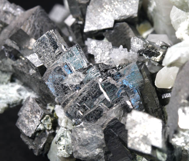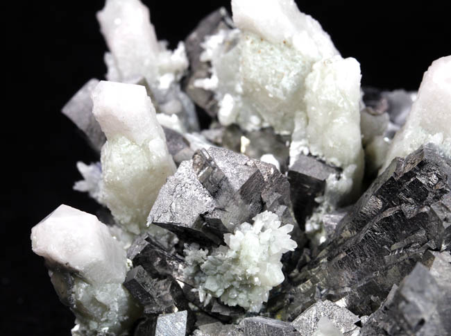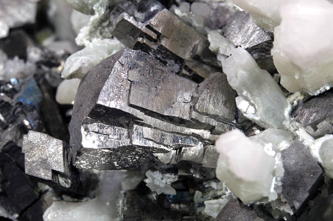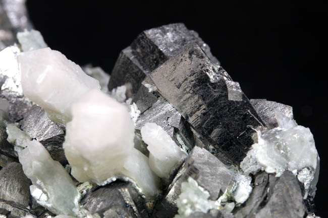 JC13915. A close up of the gray crystals...obviously not galena...sort of striated to acicular looking...bournonite? Although betekhtinite has not been reported from Huanzala, these sure look like that mineral. Be nice to have an x-ray machine handy. |