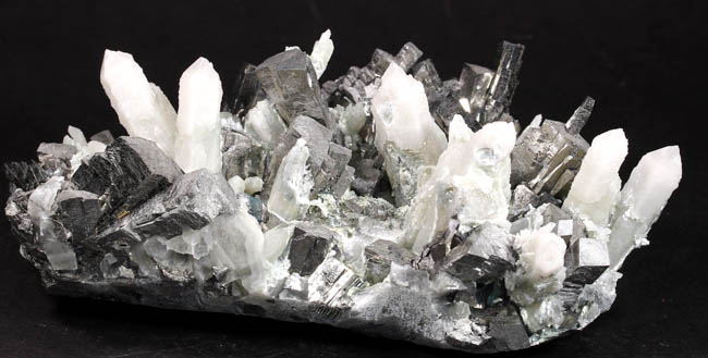 JC13909. Arsenopyrite, quartz. Huanggang Fe-Sn deposit, Hexigten Banner, Chifeng City, Inner Mongolia, China 12 x 7 x 4.5 cm 715g $250.00 From a recent find at the Huanggang mine complex. Silver, bright arsenopyrite crystals sticking straight up sort of like stubby pencils, intermixed with milky quartz crystals. There was only one Chinese dealer that had these, and they were rather pricey, so I just picked this one out of the half dozen pieces he had. Unusual for the arsenopyrites, as more columnar than normally seen, and some of them have a smaller columnar arsenopyrite on the end of the larger crystal. RESERVED |
