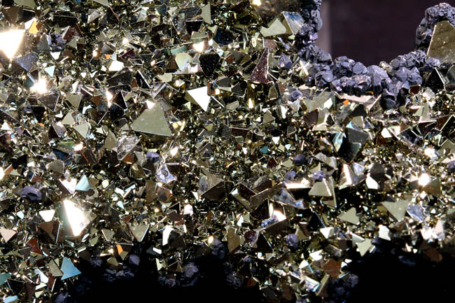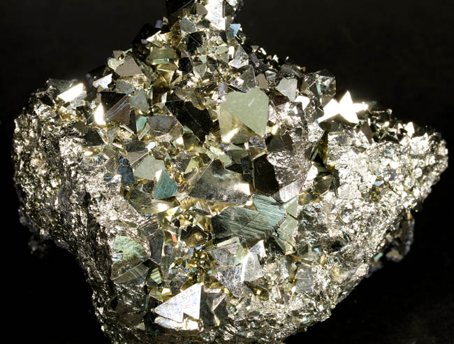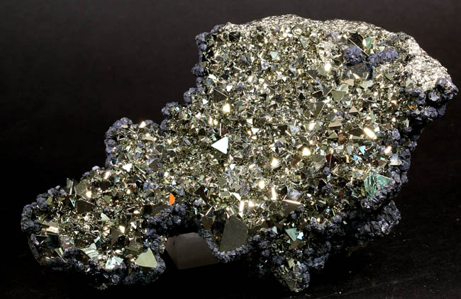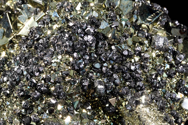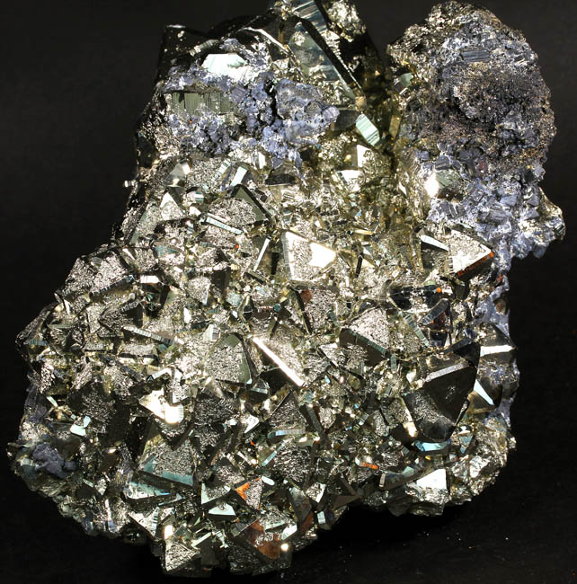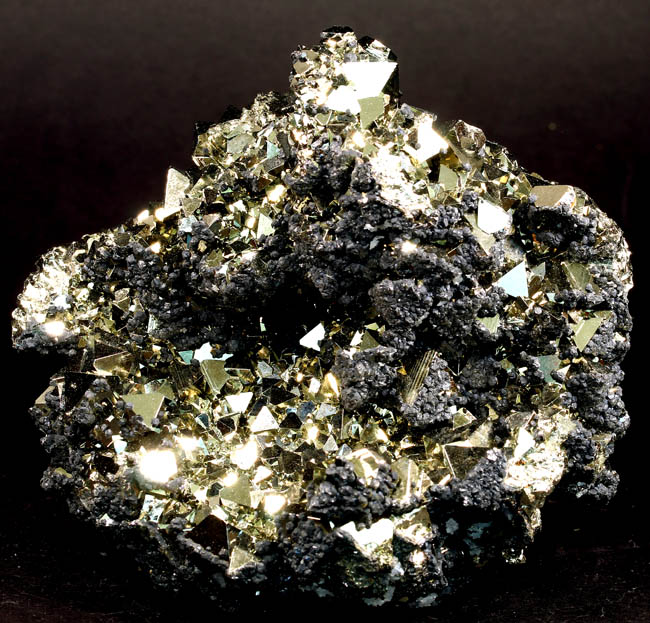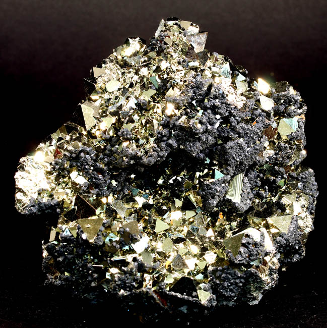 JC13911. Pyrite, sphalerite. Huanzala Mine, Huanzala, Huallanca District, Bolognesi Province, Ancash, Peru. 10 x 9 x 6 cm 996g $150.00. Brilliant octahedral crystals set off by contrasting small near black sphalerite crystals. These are from a recent hit at Huanzala, and are outstanding for their brilliance and placement of the octahedrons. Seems like everyone has a Huanzala pyrite, but these are really exquisite and stand out beautifully in any cabinet. It is hard to get good photos because of the brilliance of the pyrite, and I have photographed this one from several angles. |