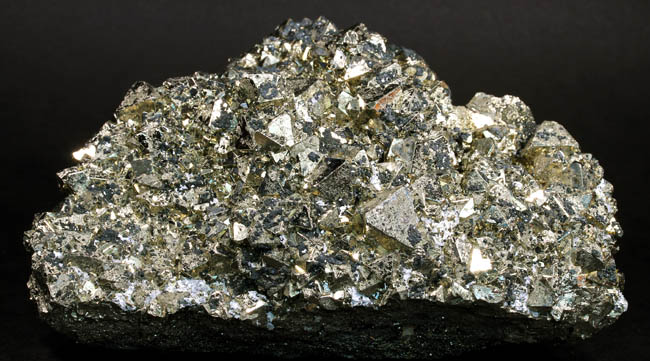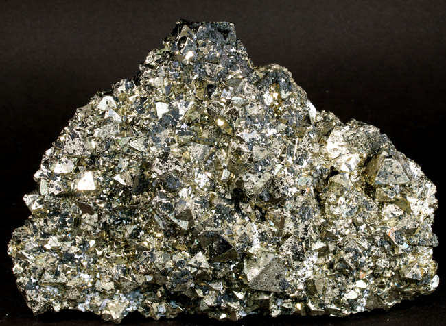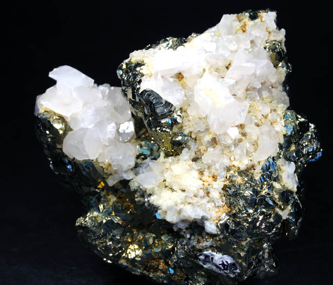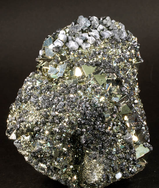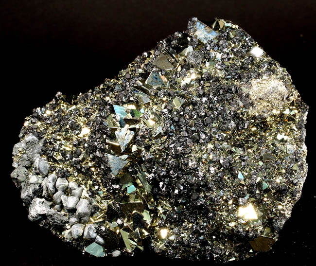 JC13913. Pyrite, sphalerite, bournonite. Huanzala Mine, Huanzala, Huallanca District, Bolognesi Province, Ancash, Peru. 13.5 x 10 x 4 cm 1,558g, nearly 3.5 Lbs., $175.00 Brilliant octahedral crystals set off by contrasting, scattered small, near black sphalerite crystals and silvery gray bournonite. These are from a recent hit at Huanzala, and are outstanding for their brilliance and placement of the octahedrons. Seems like everyone has a Huanzala pyrite, but these are really exquisite and stand out beautifully in any cabinet. It is hard to get good photos because of the brilliance of the pyrite, and I have photographed this one from three angles. |