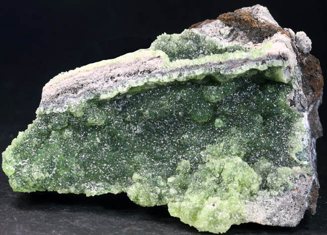JC13916. Smithsonite. 79 Mine, Chilito, Hayden area, Banner Mining District, Gila County, Arizona. 9.5 x 6 x 3.5 cm 238g $80.00. Typical green smithsonite from the 79 mine, these actually sparkle, as can be seen by the tiny white spots of light reflected off the tiny smithsonite crystals. RESERVED |
