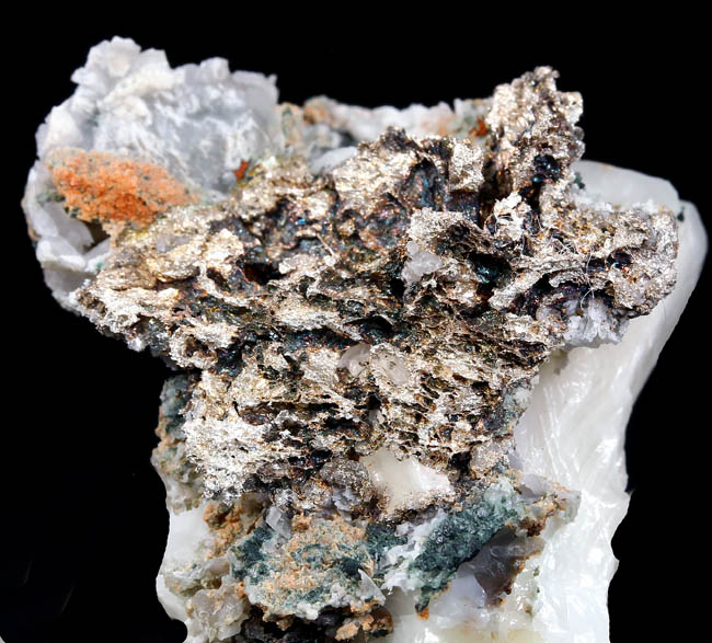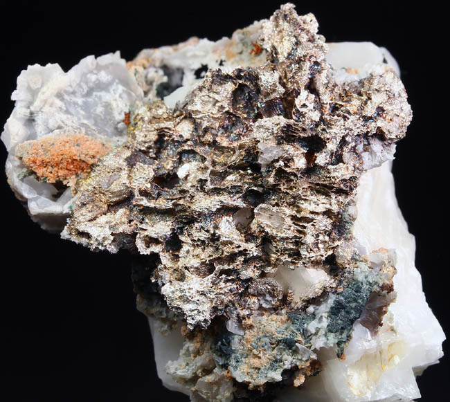 JC13930. Silver. Mass Mine, Mass Consolidated Mine, Mass City, Ontonagon County, Michigan. 4 x 3.5 x 2 cm $150.00. Nice miniature of silver from this rarely seen locality for silver. Sort of hackly silver etched out of calcite. Not sure when it was collected...the mine shut down in 1899. Rare to see one of these for sale. .EX: Keweenaw Minerals as old label with the specimen. Ex: James Smith collection. RESERVED |