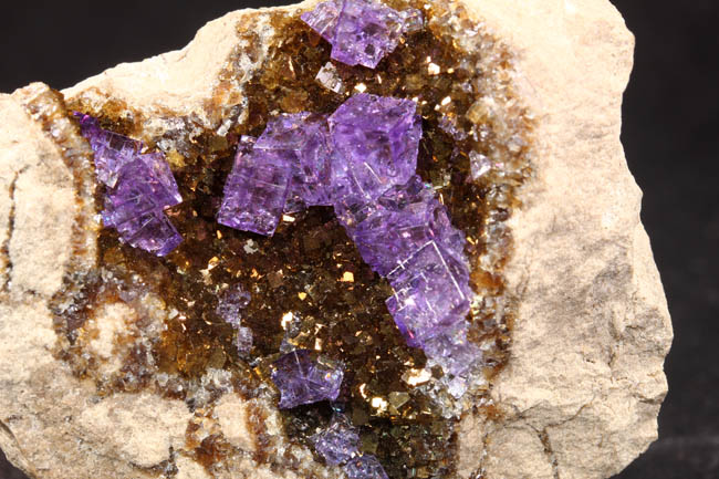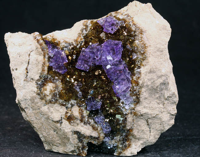 JC13935. Fluorite. Stoneco Auglaize Quarry, Junction, Paulding County, Ohio. 5.5 x 5 x 2 cm 110g $185.00 A choice miniature with the bright purple secondary fluorite cubes on the brown underlying smaller fluorite cubes. Collected by John Medici, Summer 1999. I purchased it from him at the Tucson show in January 2000. Ex Crowley collection #: JAC1463. A miniature of this quality from here is quite rare these days. RESERVED |