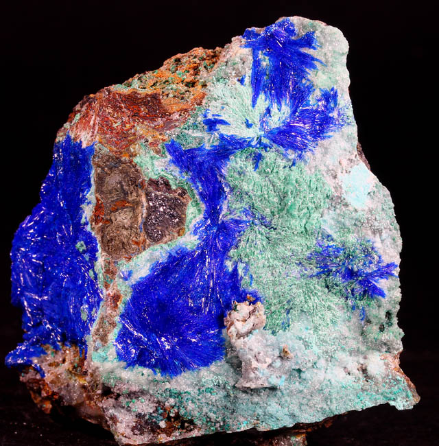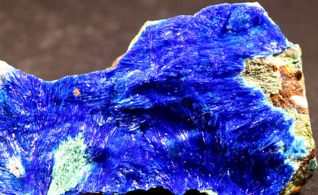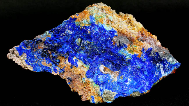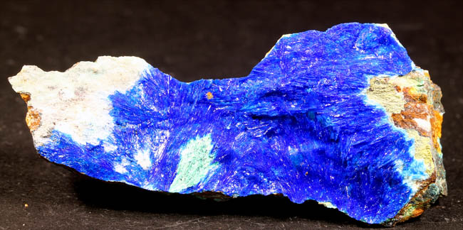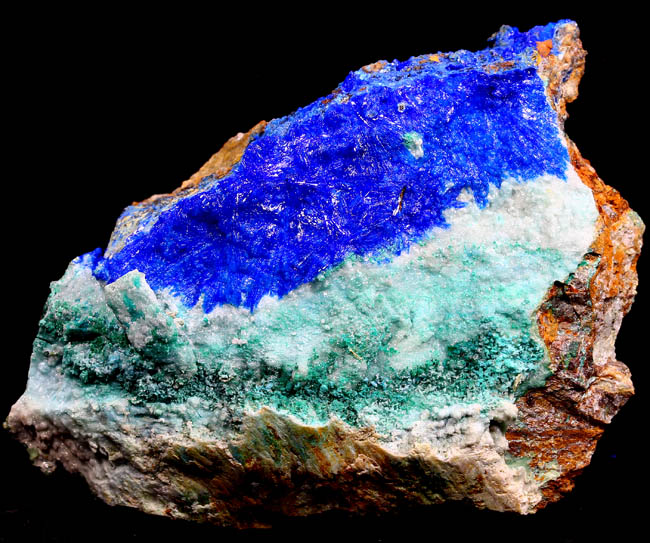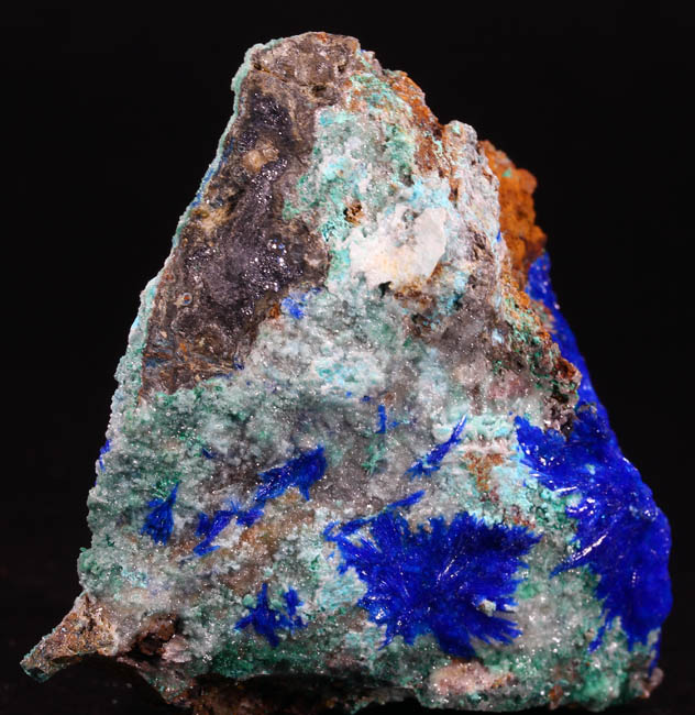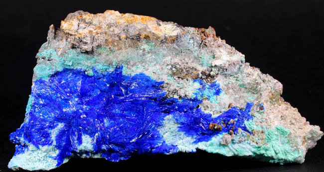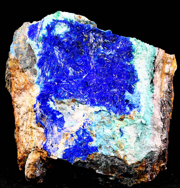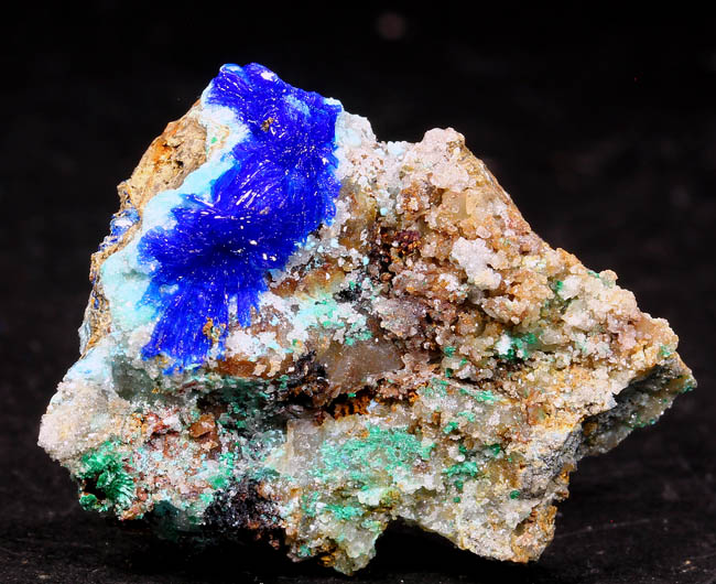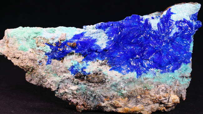JC13780. Linarite, anglesite? & ? Dispozitch mine, Silver Star Mining district, Mineral county, Nevada. 11 x 5 x 3.5 cm 282g Linarite on both sides $265.00. The linarite is on both sides, no damage, Brilliant blue crystals a bit darker than the photo shows. Appears to be some altered brochantite in the light green areas. Micro crystalline tiny clear crystals around the linarite...possibly anglesite. Very nice piece. RESERVED |