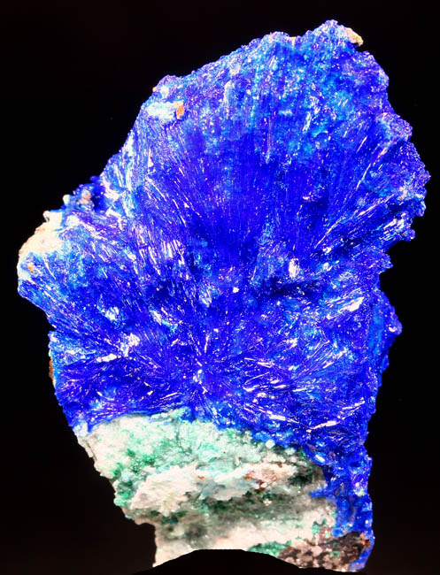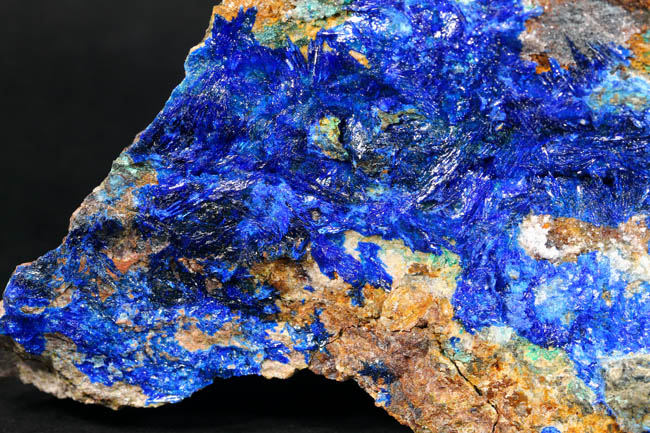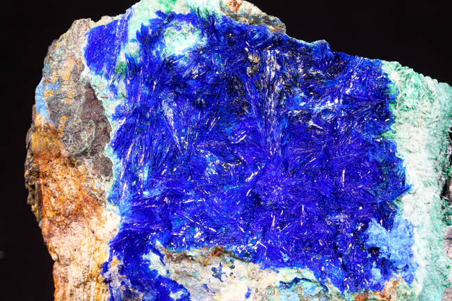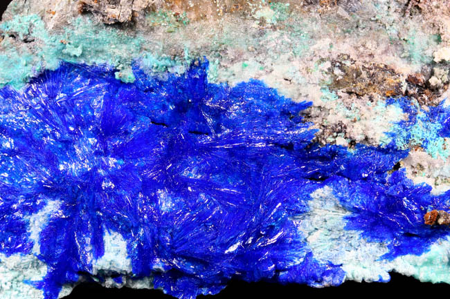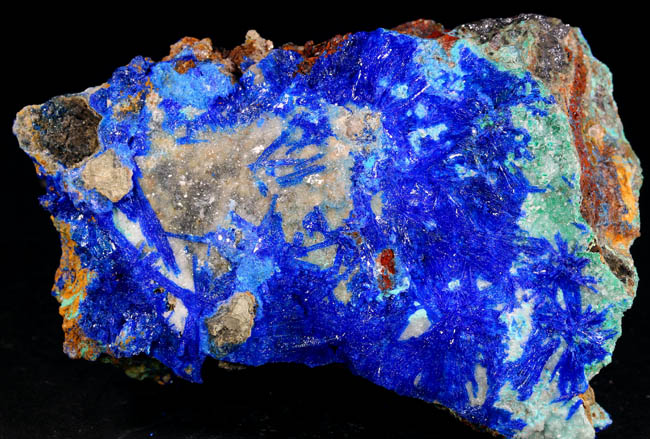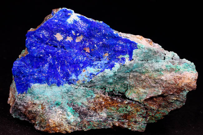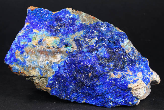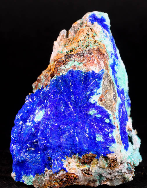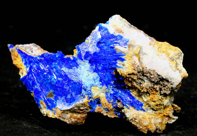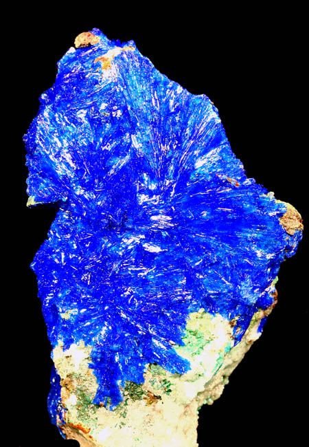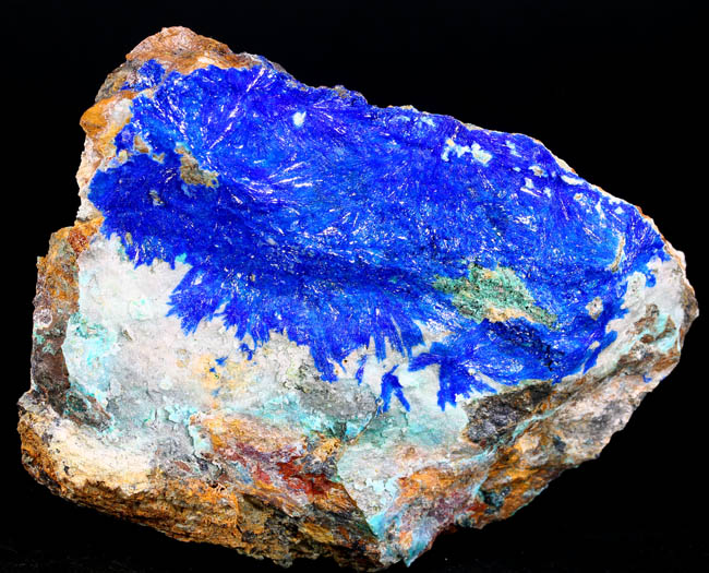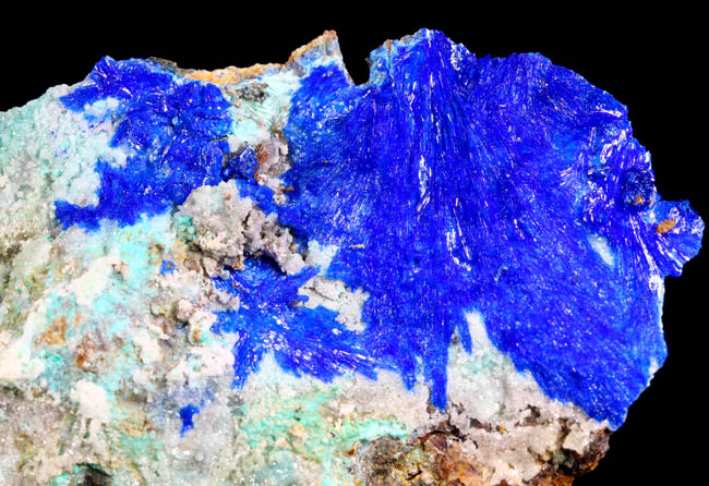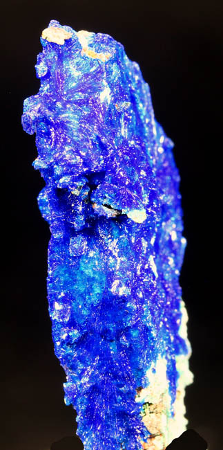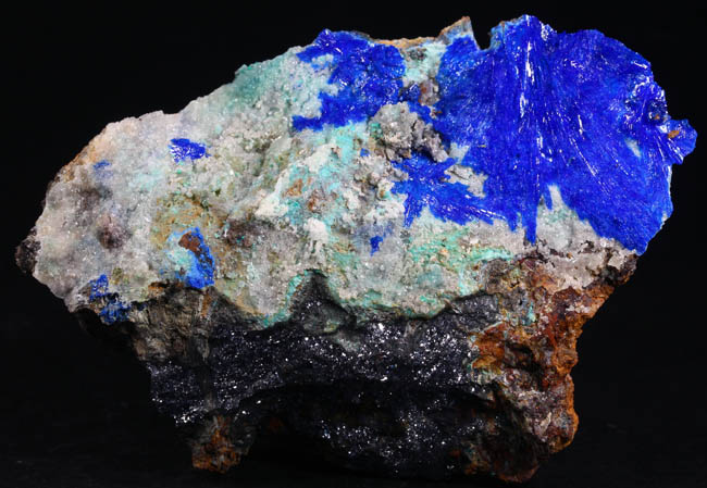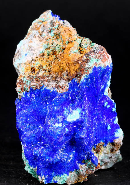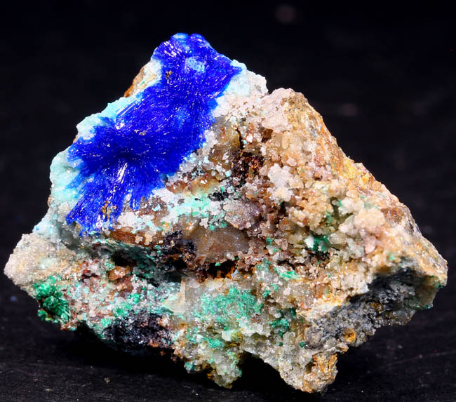 JC13786. Linarite, anglesite? & ? Dispozitch mine, Silver Star Mining district, Mineral county, Nevada. 6 x 6 x 5 cm 356g $130.00 Brilliant dark blue sprays of linarite with light colored micro crystals of anglesite? and ? along the right side. The light areas in the lower center is where no linarite formed...maybe in contact with opposite side of the vein? |