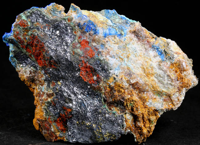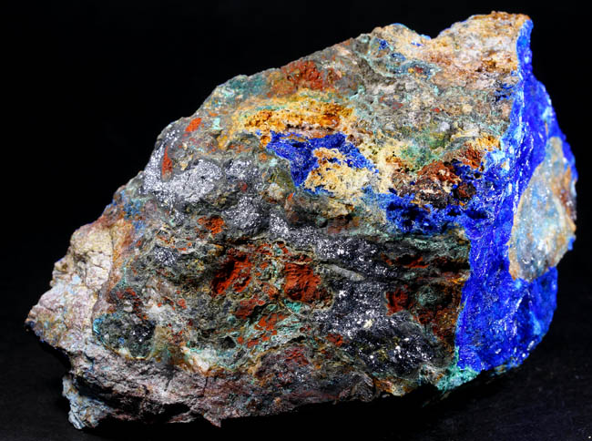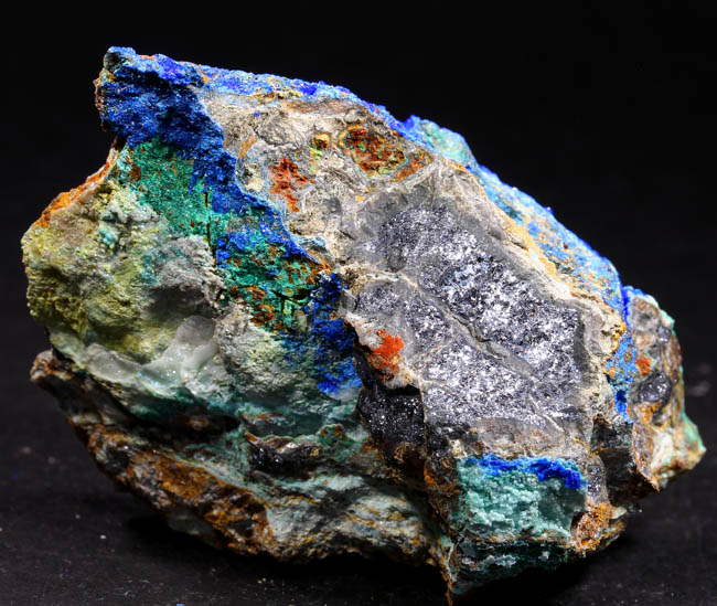 JC13781. Linarite, anglesite? & ? Dispozitch mine, Silver Star Mining district, Mineral county, Nevada. 10 x 6 x 6.5 cm 732g $285.00. Dark blue and medium blue sparkly, glassy luster linarite. The light area on the left appears to be micro crystalline, sparkly anglesite...the white part there looks like where the vein was in slight contact with the opposite wall. These all occurred in thin veins in galena rich matrix and wall rock. There is linarite on two sides...see photo below. Sparkles nicely. |