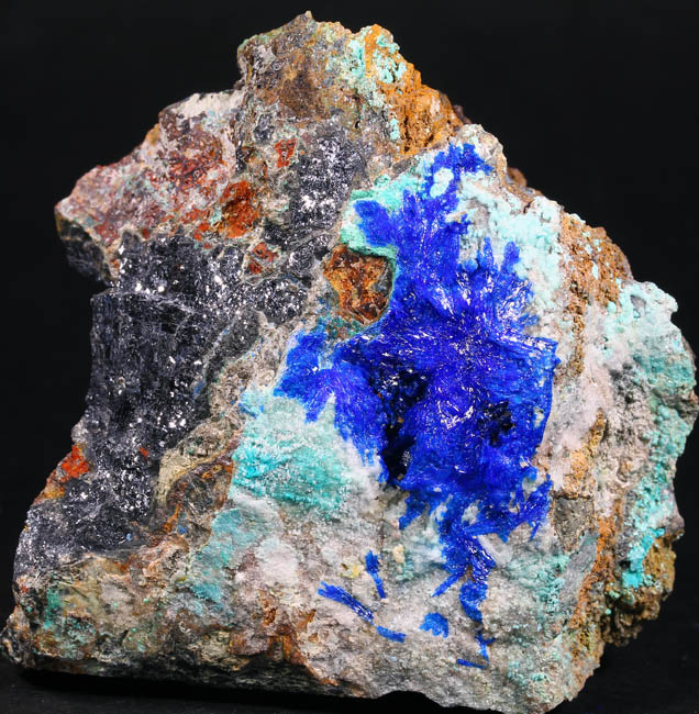 JC13788. Linarite, galena, anglesite? & ? Dispozitch mine, Silver Star Mining district, Mineral county, Nevada. 7 x 5 x 2 cm 127g $110.00 Brilliant dark blue sprays of linarite surrounded by micro crystalline sparkly anglesite? and ?. Nice contrast is area of brilliant, sparkly "steel" galena. RESERVED |