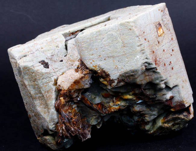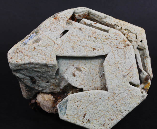 JC12077. Smithsonite. San Antonio Mine, East Camp, Santa Eulalia Mining District, Aquiles Serdán Municipality, Chihuahua, Mexico. 6 x 8 cm 268g. $75.00 Interesting finger of smithsonite sticking up from the central area. The color is a sort of a light gray with slight yellowish tints here and there. Fairly lustrous and sparkly...all the white specks are sparkles off crystal faces. |