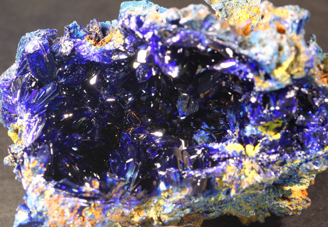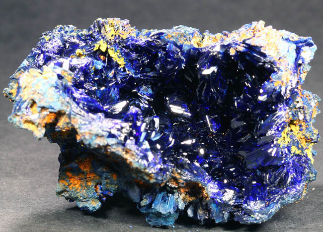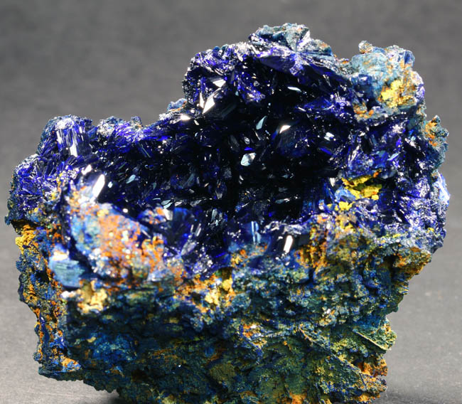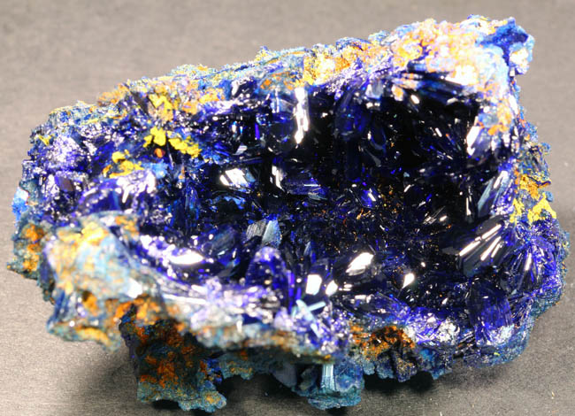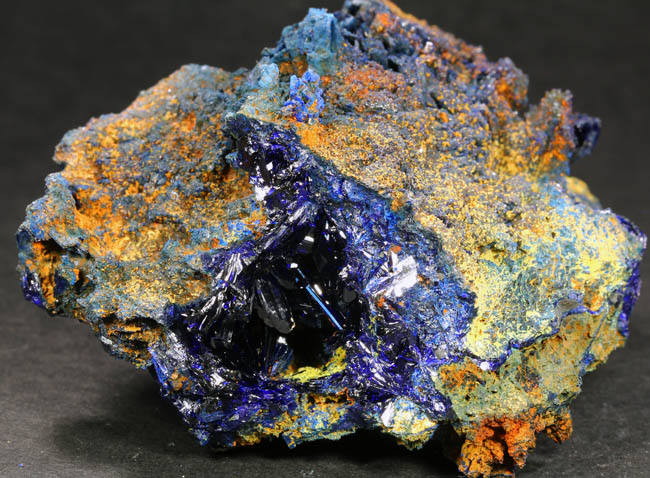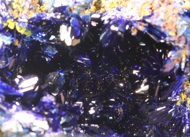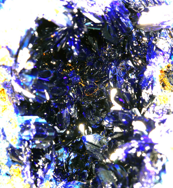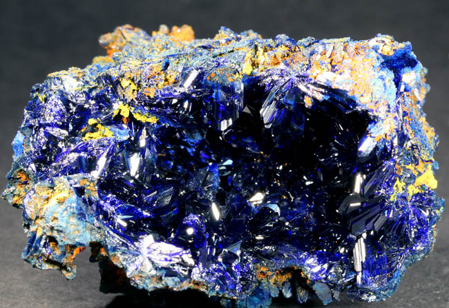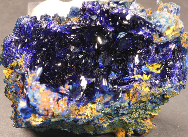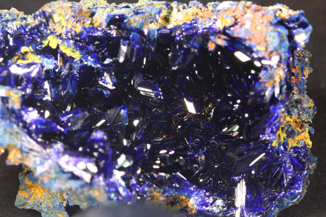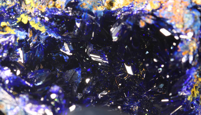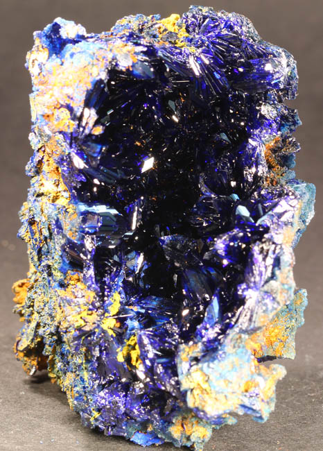 BR298. Azurite. Touissit, Touissit-Bou Beker mining district, Jerada Province, Oriental Region, Morocco. 6.5 x 4 x 4 cm $900.00 Vug= 3 x 5 cm. 170g Vug with dark blue brilliant crystals up to 1 cm. Ex: Jim Clark coll. Ex: Mineralogical Research Purchase:8-2001. An absolutely gorgeous specimen from the finds of the 1990's at Touissit. Brilliant, glassy, gemmy crystals in an approximately 5 cm wide opening. The piece is sort of geode like. The crystals extend all the way to the back side, where a small hole shows more crystals...this shown in a photo below. These are virtually unavailable these days. I took a lot of photos of this one, maybe a bit of overkill, but trying to show how beautiful this piece is. |