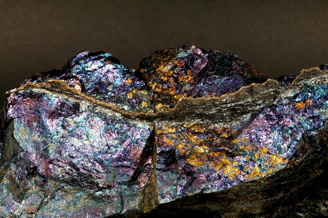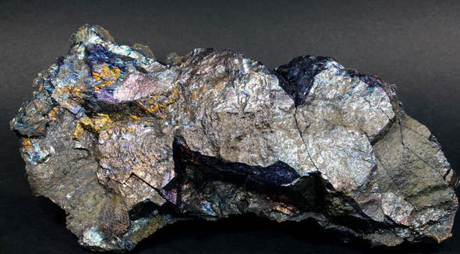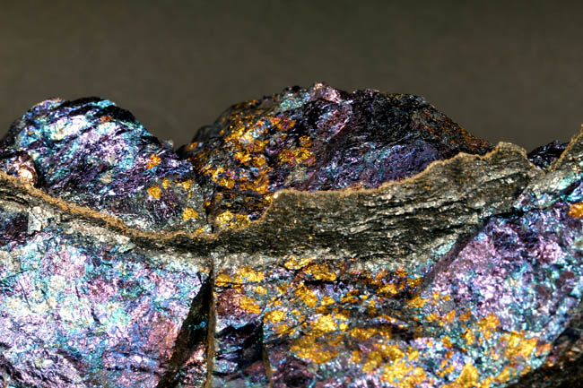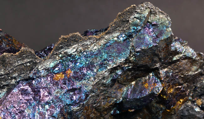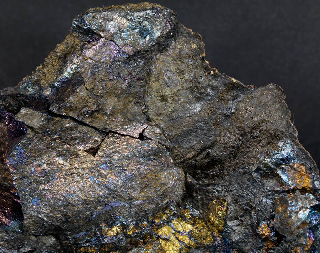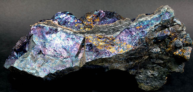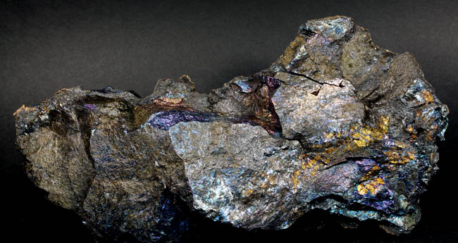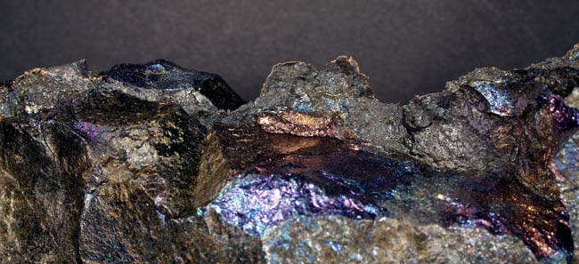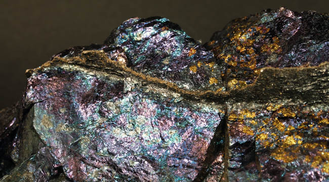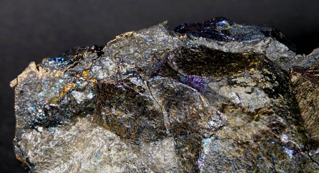 BR600. One of the veins of silver...its all along the right side of the photo, and is a bit more blackish than the bornite. The silver is coated with what appears to be bornite, which masks the silver color. Looking closely, you can see the color of the silver here and there along the extreme top edge of the silver. |