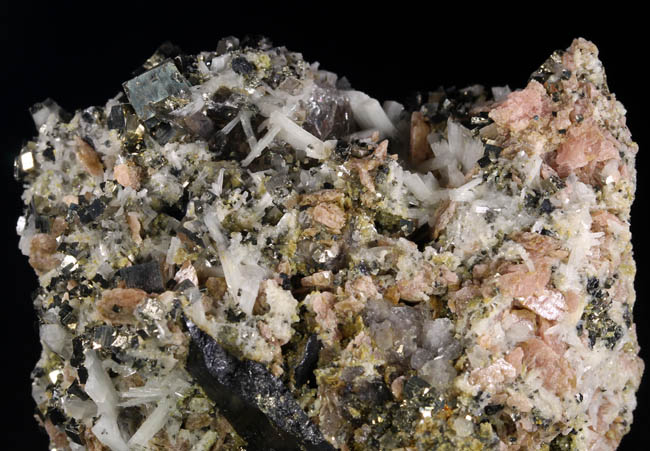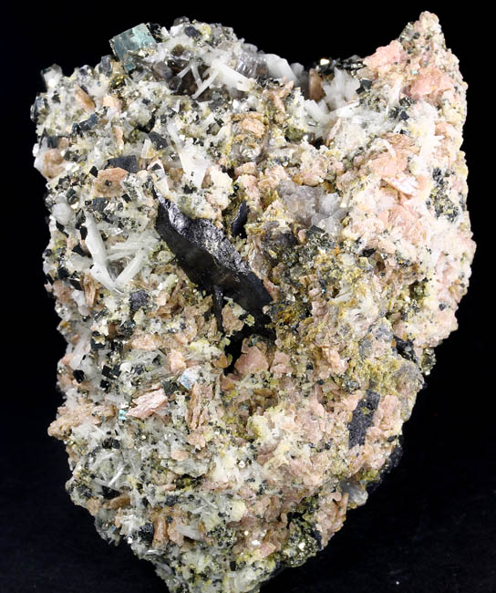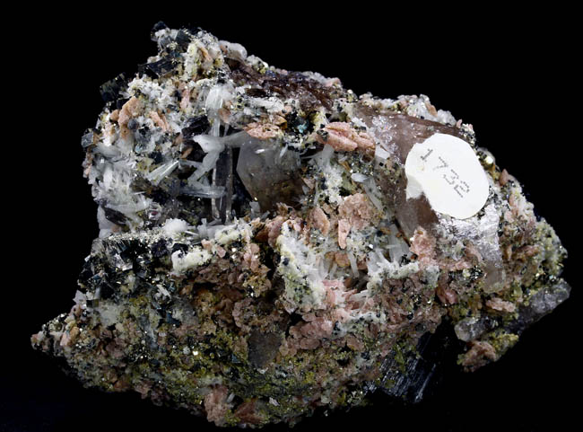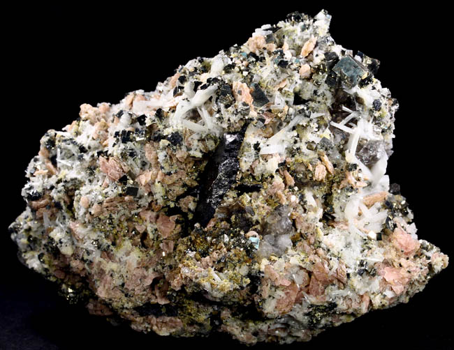 JC11856. Bertrandite, rhodochrosite, wolframite, pyrite. Kara-Oba W deposit, Betpakdala Desert , Karazhal, Karaganda Region, Kazakhstan. 6 x 8 cm 266g $150.00 Pink rhodochrosite crystals intermixed with white bertrandite crystals and a incomplete wolframite crystal in the center. Bertrandite is not often seen in good display quality specimens, but Kara-Oba had the distinction of producing some fine Bertrandites (a rare beryllium species) in the early 1990s. These pieces were short-lived and quickly disappeared from the market. These came out about 30 years ago. RESERVED |