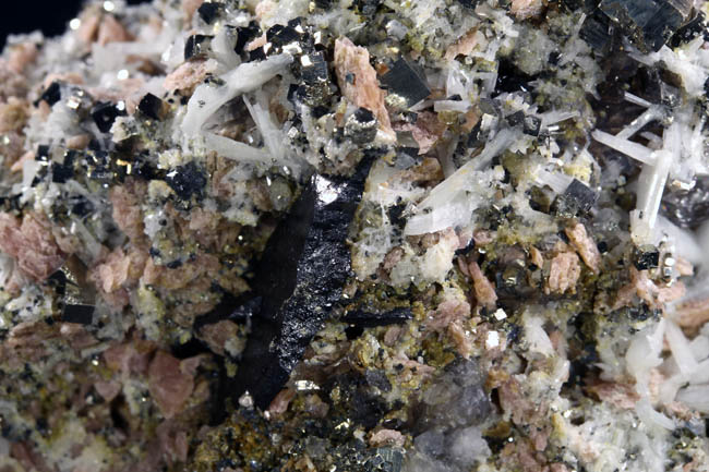 BR600. One of the veins of silver...its all along the top part from one side of the photo to the other. The silver is coated with what appears to be bornite, which masks the silver color, although you can see a bit of the silver color along the very top of the vein as sort of white/pinkish color. |