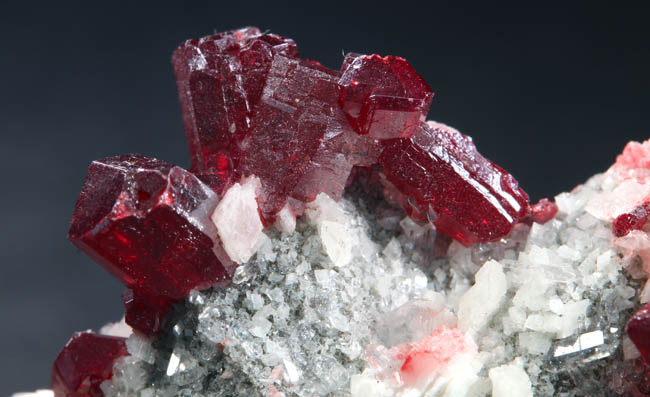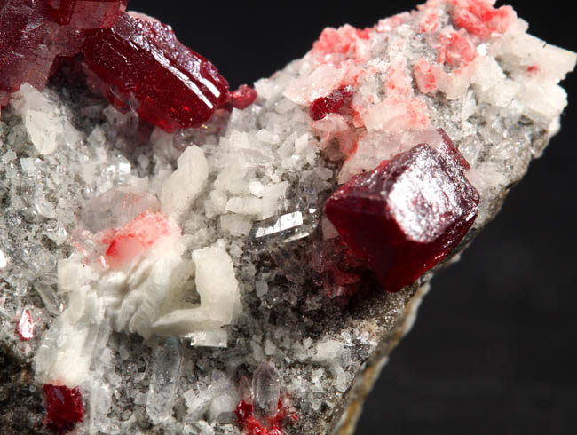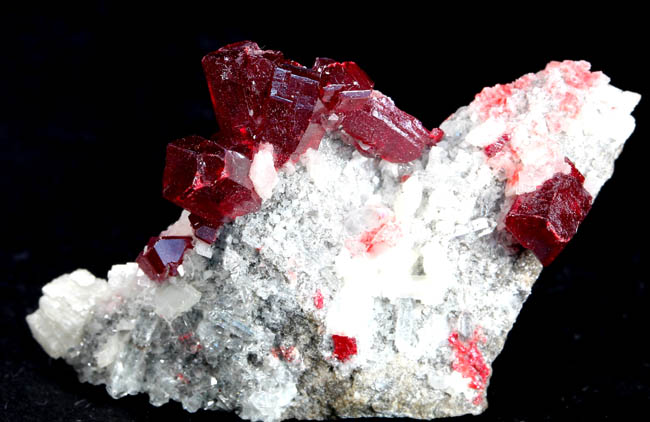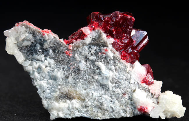 JC12055. Cinnabar, quartz, dolomite. Tongren Mine, Tongren, Guizhou, China. 2.5 x 4 cm 9g $40.00 Nice little group with dolomite crystals scattered around. |