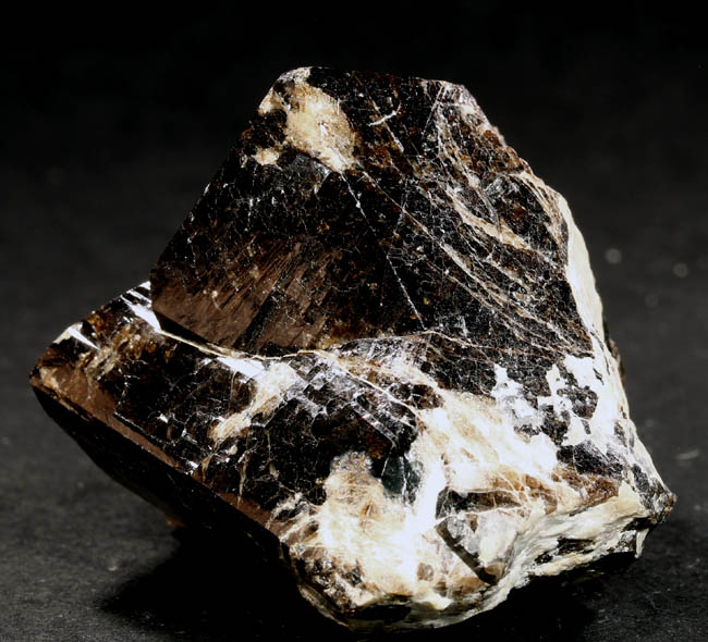 JC12084. Cassiterite. Piaotang mine, Xihuashan ore field, Dayu county, Ganzhou, Jiangxi, China. 4 x 4.5 cm 246g $150.00. A very large, for the locality, cassiterite. The white spots are growth irregularities rather than damage. There is a tiny ding on the tip of the crystal facing out. |