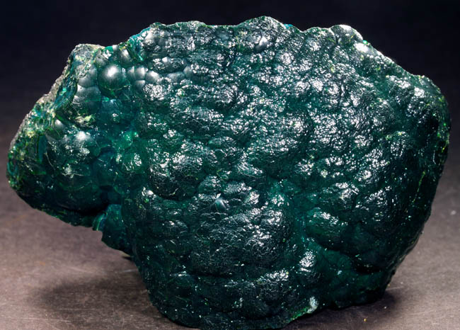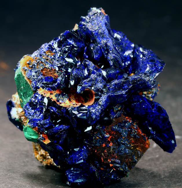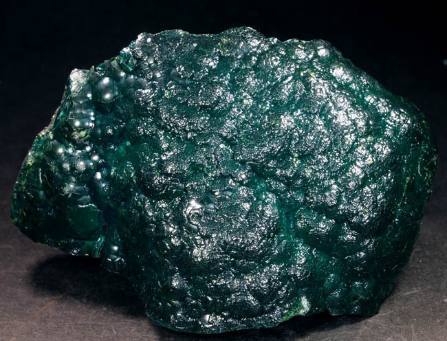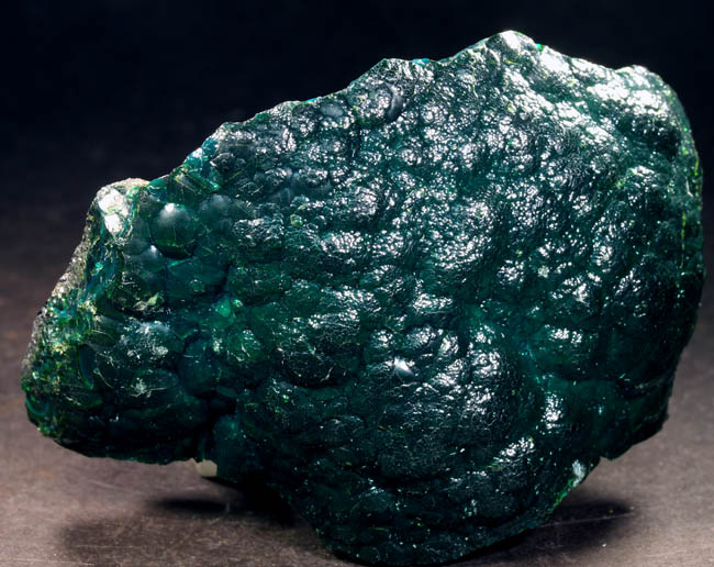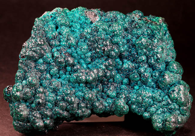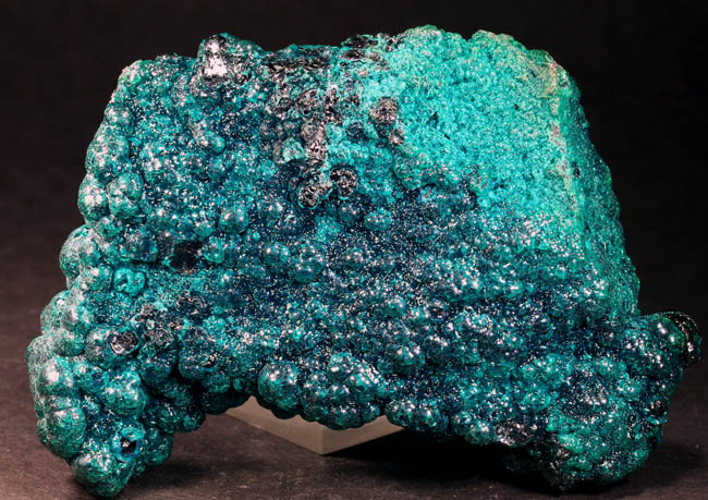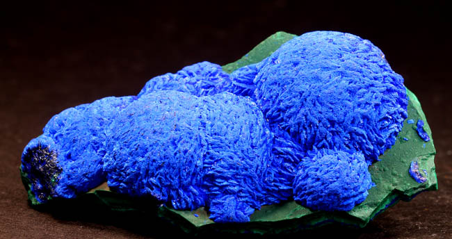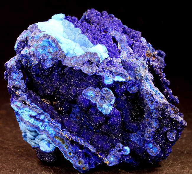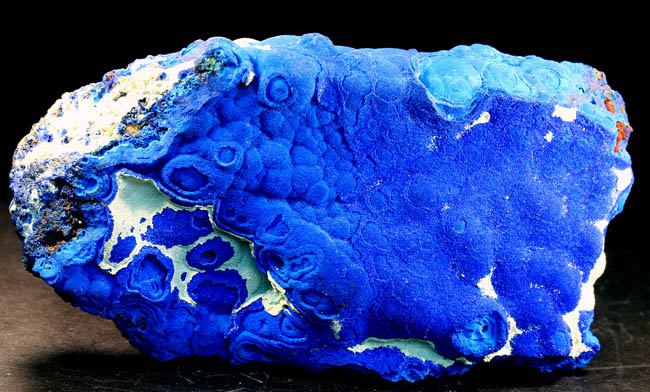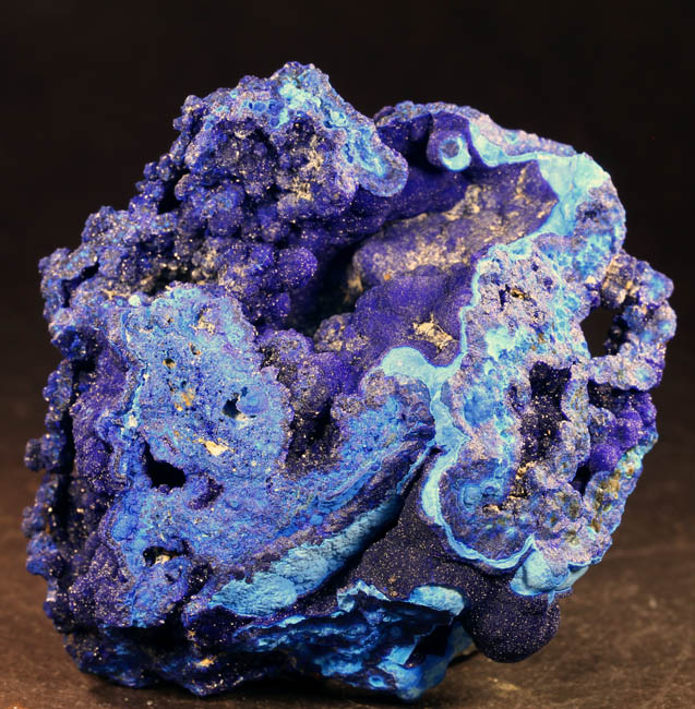 BR167. Chrysocolla. Star of the Congo Mine, Lubumbashi, Haut-Katanga, DR Congo (L'Etoile du Congo Mine, Lubumbashi, Haut-Katanga, DR Congo; Kalukuluku Mine). 9.7 x 7 cm 202g $245.00 Dark blue 7 mm coating on matrix. A superb plate of rolling hillocks of intense deep blue chrysocolla. The shine and luster and overall brightness is incredible. Pretty. Even in minimal light, it throws off color like a shimmering metallic layer of cloth. It is one of the best of this material I have seen from a major find of 20 or so years ago. Ex: Adrianne & Jeff Jewett Purchased: 4-2003 |