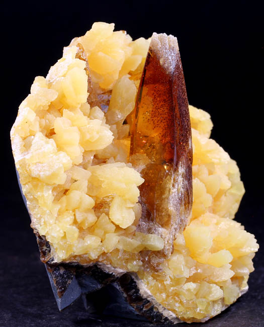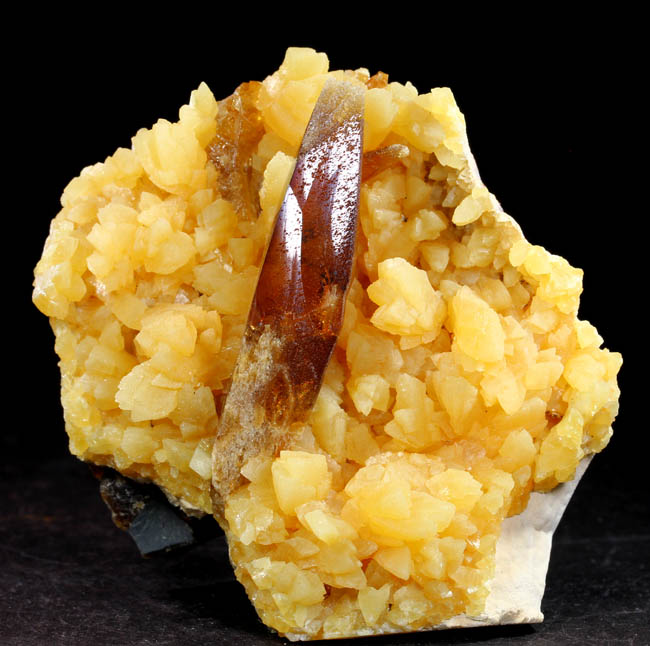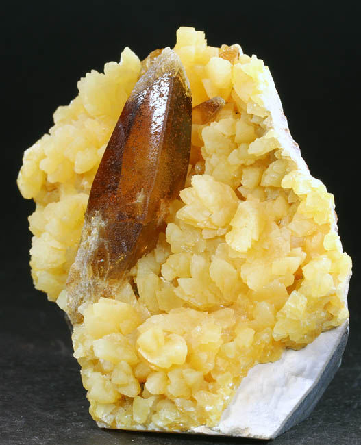 BR261. Barite, calcite. Elk creek, Meade county, South Dakota. 7 x 6.5 cm 177g $550.00 A 4 cm crystal on calcite crystals. Ex: Jean-Pierre Cand coll. Purchased: 4-2003 At California State Mine Museum. Has been shaped by several saw marks on the back, and on the bottom of the piece, visible in this photo. The big septarian concretions from Elk Creek in western South Dakota produce abundant Calcite and some fossils, but yield few choice specimens hosting large, root beer colored Barite crystals on contrasting yellow Calcite such as this one. This well composed and well balanced specimen represents one of the few cabinet pieces hosting a large, undamaged and unrepaired Barite. A quite choice example of these, with a chisel shaped termination. RESERVED |