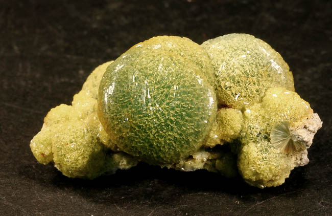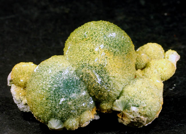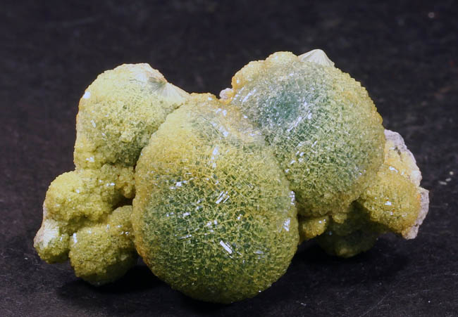 BR267. Wavellite. Mt. Ida, Montgomery co., Arkansas. 4 x 2 x 2 cm 15g $150.00 A pale, yellow green ball, lustrous. Ex: Fraziers Minerals, Purchased : 11-2002 . A bit different from most of these as the crystal faces are quite obvious. Much better than most seen from here these days. RESERVED |