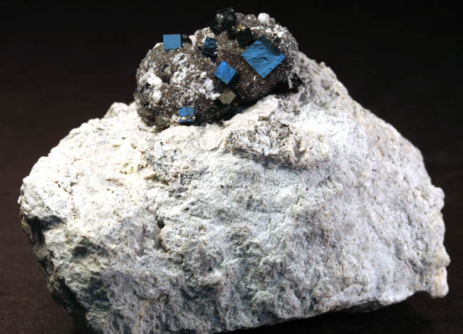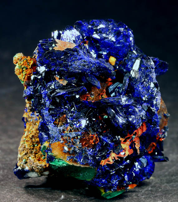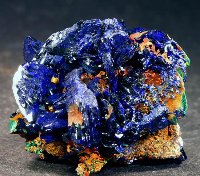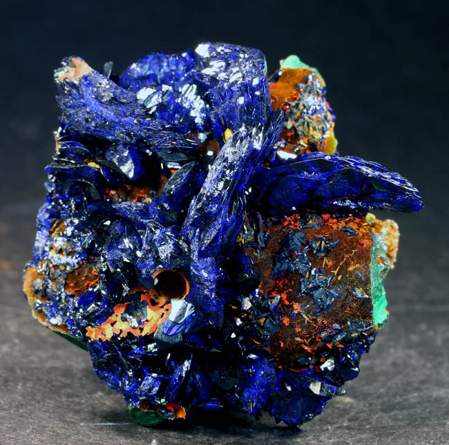 BR337. Azurite. Copper Queen mine, Bisbee, Cochise county, Arizona. 5 x 4 x 3.5 cm 65g $1,175.00 Brilliant dark blue bladed crystals to 2 cm Collected: Approx. 1883. Ex: Evan Jones coll. Purchased: 10-2001. Some of the main crystals have the upper edges sort of scraped, this can be seen in this and some of the photos below. Still a superb piece, very rarely seen for sale these days. I took photos from all angles. |