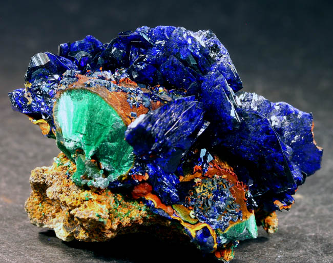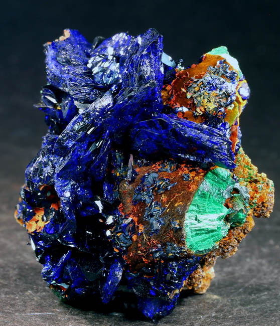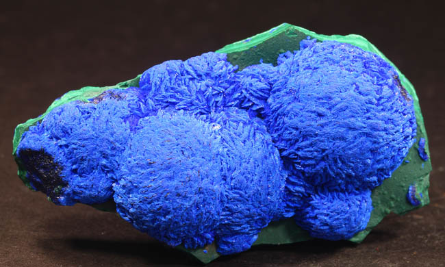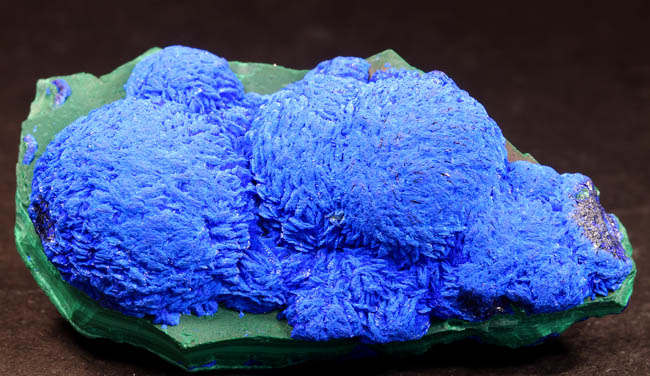 BR448. Azurite, malachite. Metcalf mine, Clifton, Greenlee county, Arizona. 6.7 x 3.3 cm 71g $345.00 Brilliant blue, matt finish azurite on malachite. Pretty. Ex: Mineralogical Research, Purchased: 11-2010 RESERVED |