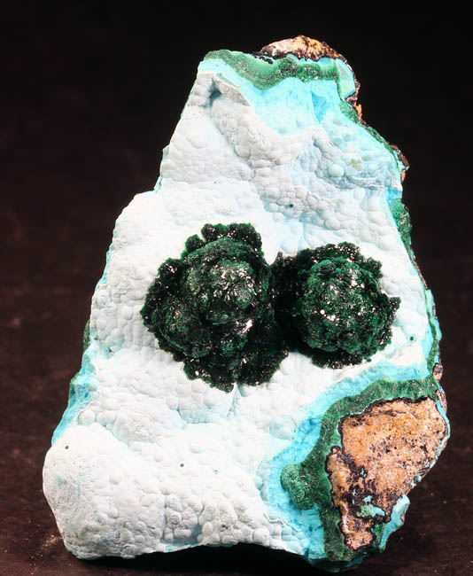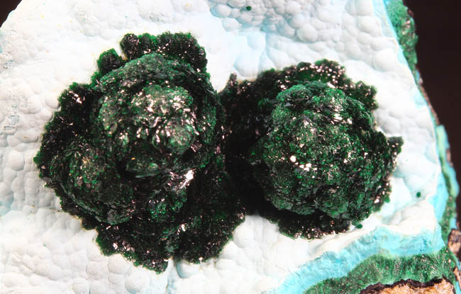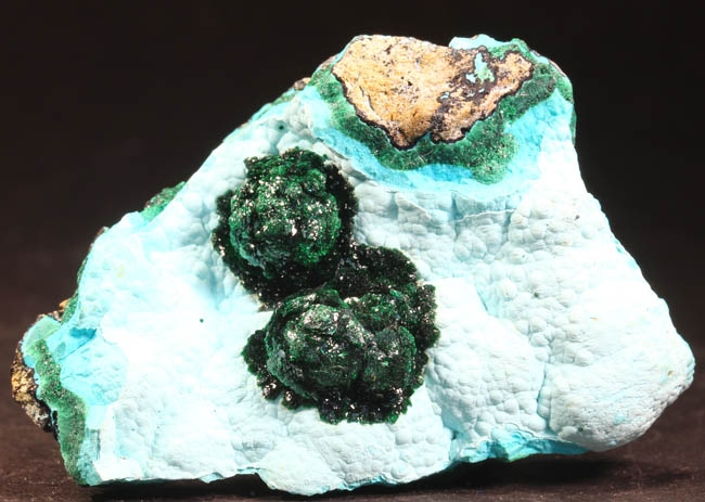 BR350. Malachite (primary). Star of the Congo Mine, Lubumbashi, Haut-Katanga, DR Congo (L'Etoile du Congo Mine, Lubumbashi, Haut-Katanga, DR Congo; Kalukuluku Mine). 5 x 4 x 1 cm 30g $90.00 Two flattened balls, largest 1.7 cm on light blue chrysocolla. Ex. Frazier's Minerals. Rather different, with the two balls of primary malachite sitting separate on light blue chrysocolla. I Have not seen any others from here quite like this. |