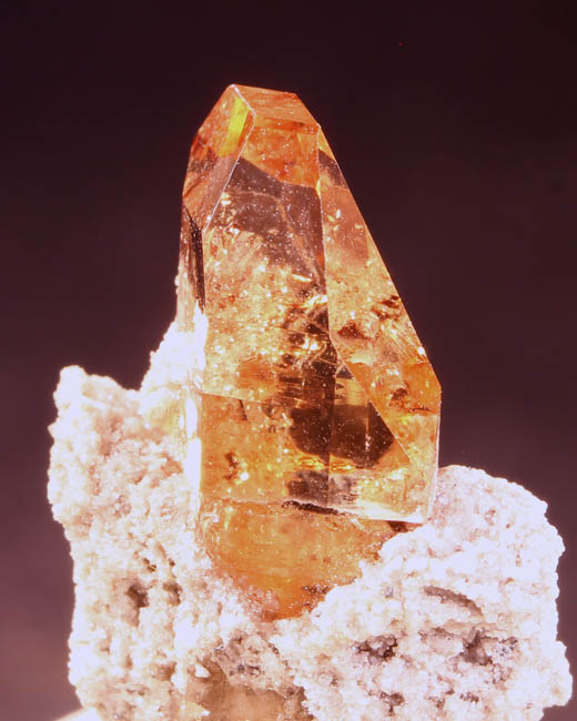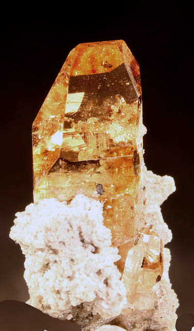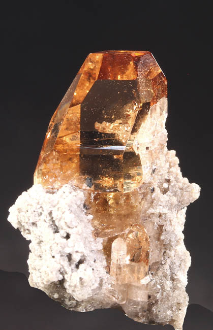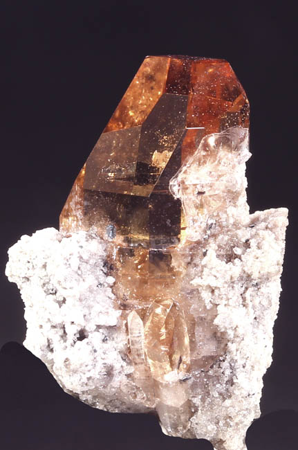 BR463. Topaz. Thomas Range, Juab county, Utah. 2.3 cm tall, nice amber color. 5g $75.00 Ex: Steve Satra coll. Ex: Mineralogical Research. Purchased: 11-2010. Nice sharp crystal with nice amber color crystal. RESERVED |