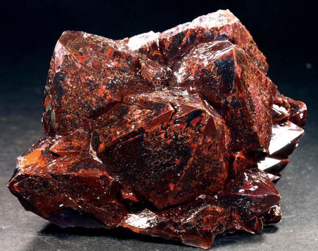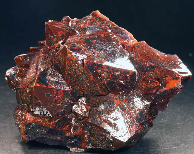 BR7. Bixbyite on garnet. Old Maynard claim, Thomas Range, Juab county, Utah. 5.5 x 4 x 4 cm 89g $150.00 Several glassy bixbyite crystals; largest 5mm on a mounded garnet on rhyolite matrix The garnet appears to be largely replaced by hematite. Ex: Horizon Mineral Company. Purchased: 3-95 . |