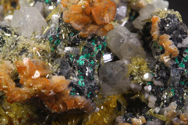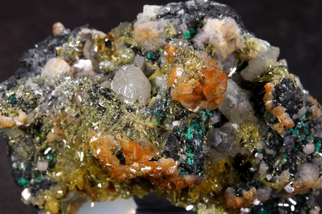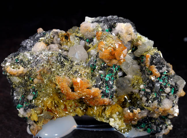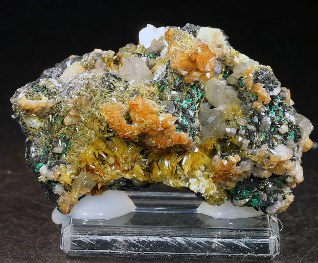 BR613. Cerussite, smithsonite, mimetite, malachite on tennantite matrix. Tsumeb mine, Tsumeb, Namibia. 5 x 5 x 3 on stand. 94g $245.00 Ex: Claude H. Yoder coll.#1601 Purchased: 10-2004. Ex: Mineralogical Research. Has old collection #779 on back. Not often you see a Tsumeb piece with such a nice combination of minerals on the same specimen. RESERVED |